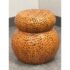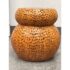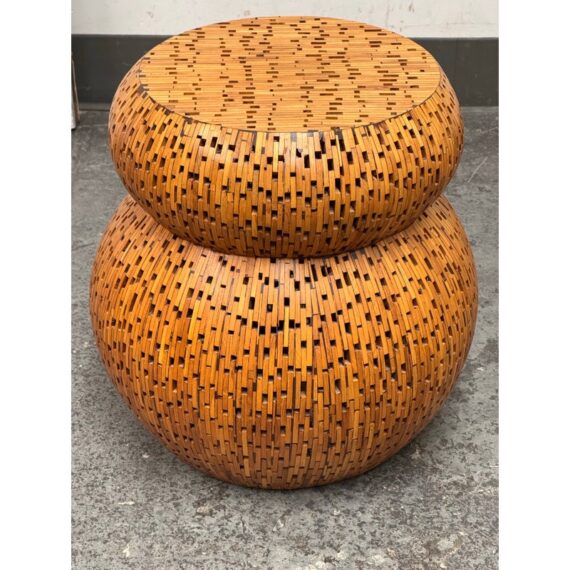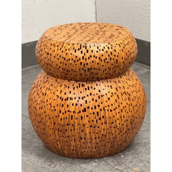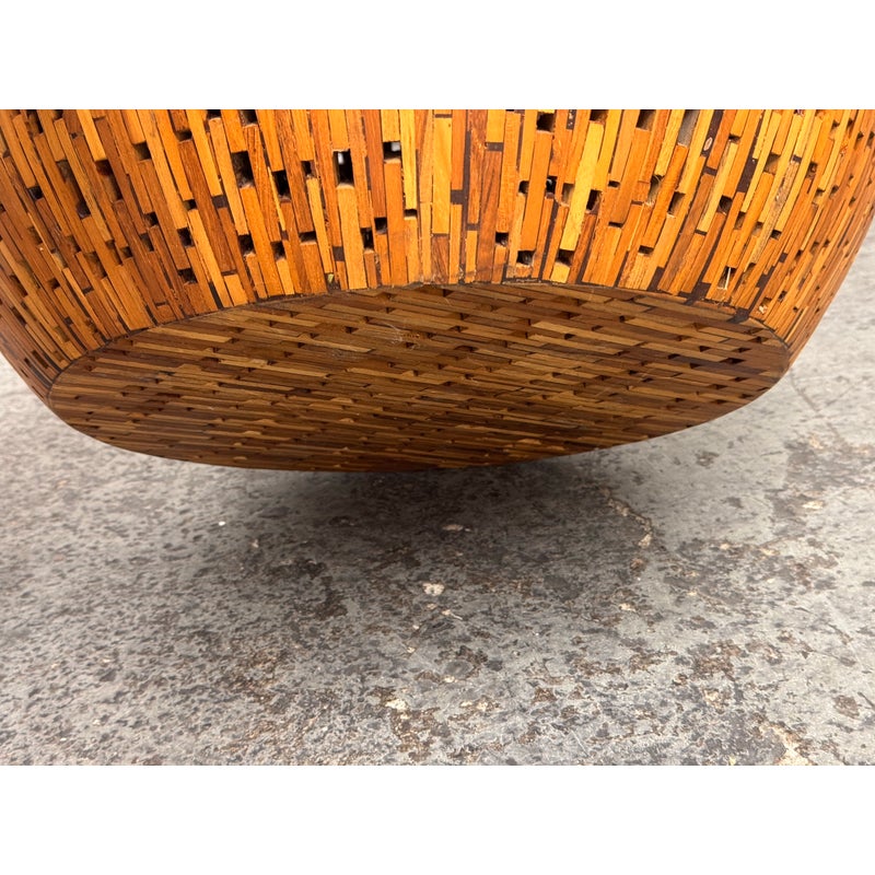 Design Plus Gallery presents a the Mushroom Teak Side Table from Portland Furniture. This rounded teak piece is composed of narrow wood slats arranged in an open linear pattern across the top and sides, creating a distinct geometric surface with visible variation in tone and grain. The drum-like silhouette is balanced by a broad circular top and softly curved body, giving the form a sculptural presence. The openwork construction and layered arrangement of the teak strips emphasize the precision of the overall design. It is in good condition with visible and minimal wear from usage.