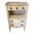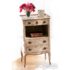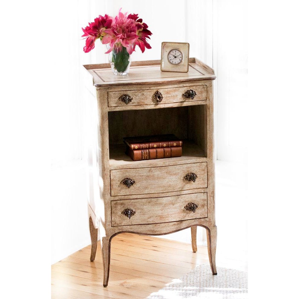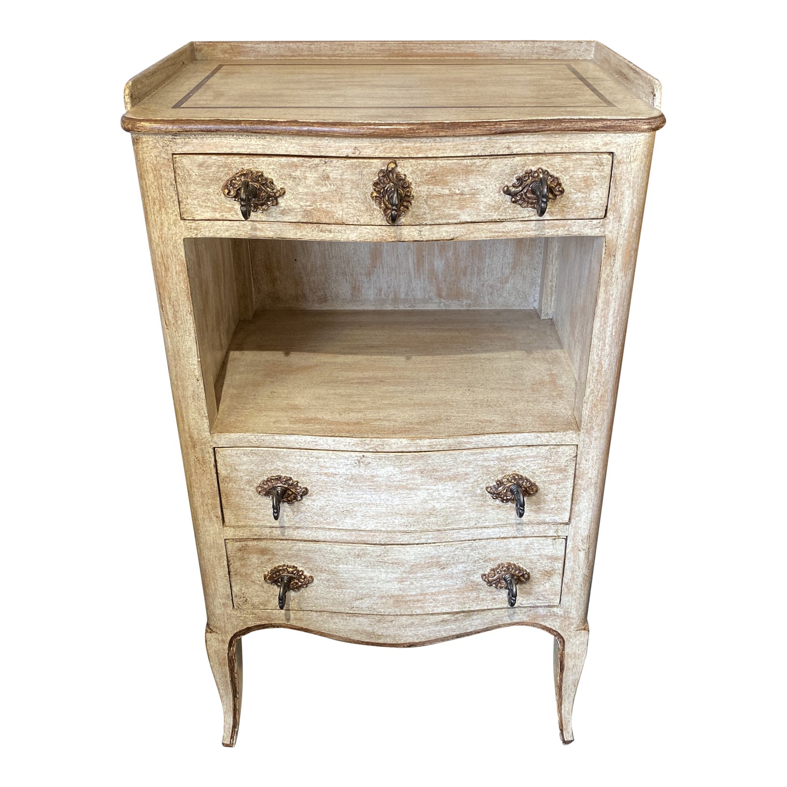 Design Plus Gallery presents an Angelique Side Table by Judson Rothschild. From the Rothschild Collection. A Louis XV provincial style, the rectangular top with serpentine front and three-quarter gallery above a frieze drawer, over an open compartment, above two further drawers, with a waved apron and resting on four slightly cabriole splayed legs, finished in a hand-rubbed brownstone white with rich brown line detail.