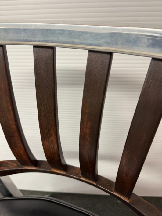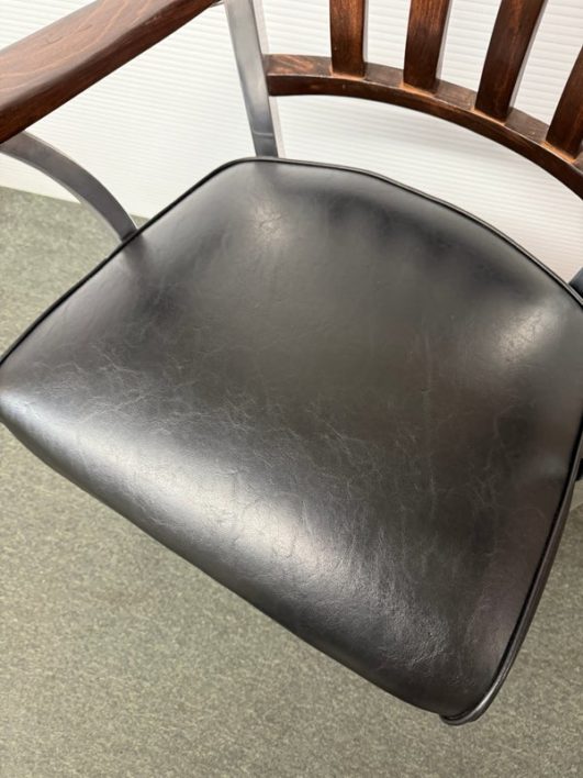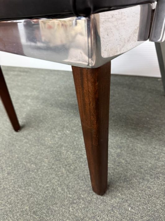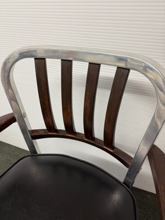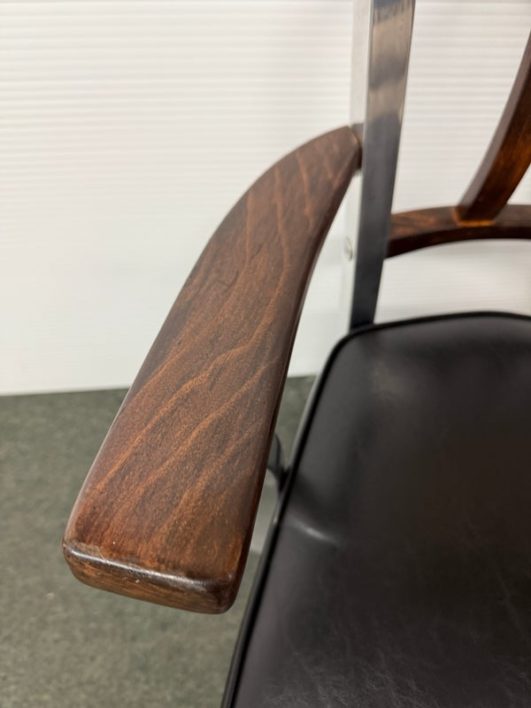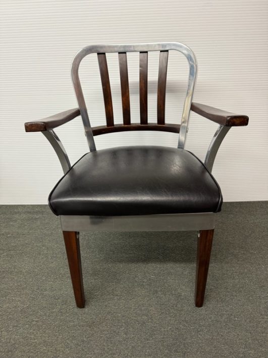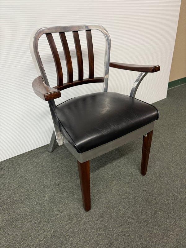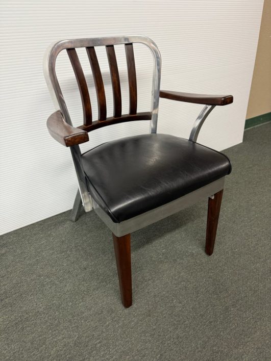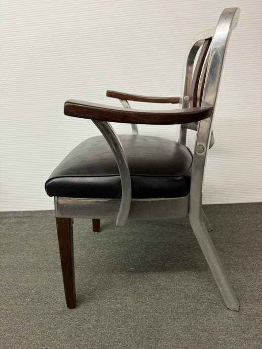 Design Plus Gallery presents a Vintage Arm Chair by The Shaw-Walker Company, Muskegon Michigan. Framed in polished aluminum, this period chair has wood arm rests and front legs, black leather cushioned seat, and attitude for days. Built in the 1960’s, the chairs have light surface wear and condition consistent with age and use.