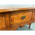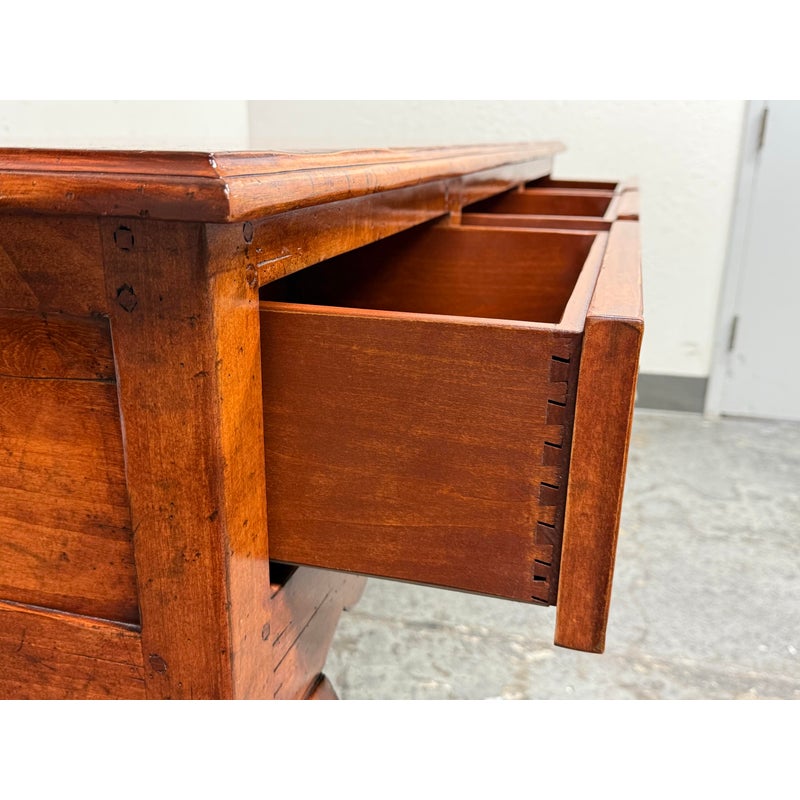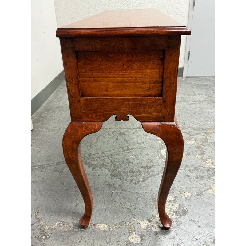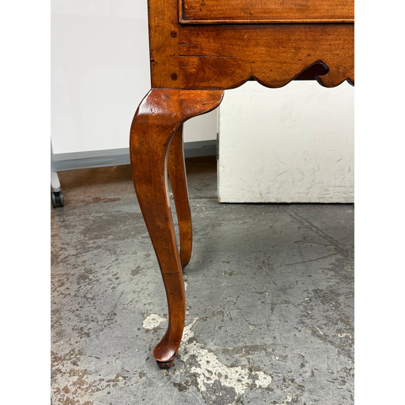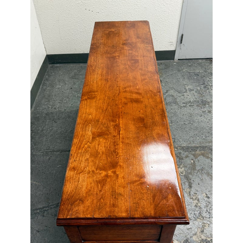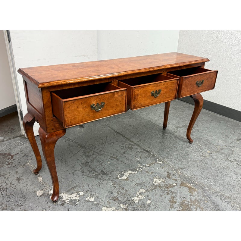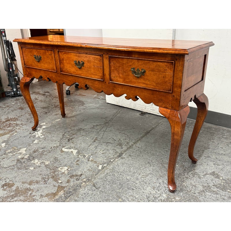 Design Plus Gallery presents a French Country Style Sideboard from Sterling Collection. The buffet has a warmth to the wood tone, nearly auburn in tone. There is scalloped design to the lower apron and elegant cabriole leg design on all four. The server offers three equal sized and deep dovetailed drawers with original antique brass hardware drawer pulls. The brand label is inset to an inner drawer. Overall the sideboard is in good condition for its usage. Made in the United States of America.