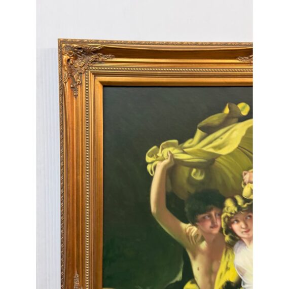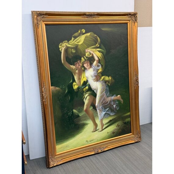 Design Plus Gallery presents “The Storm” after French artist Pierre-Auguste Cot. The original is an oil on canvas painting that was a popular success at the Salon of 1880 and has been widely reproduced as shown here. The painting is often interpreted as an illustration of a scene from the ancient Greek novel Daphnis and Chloe or the French novel Paul et Virginie, both of which feature young lovers running to take shelter from a storm. The stormy background and the couple’s disheveled clothing create a sense of dramatic movement and emotion. Condition is good; varnish has started to yellow from age.