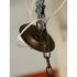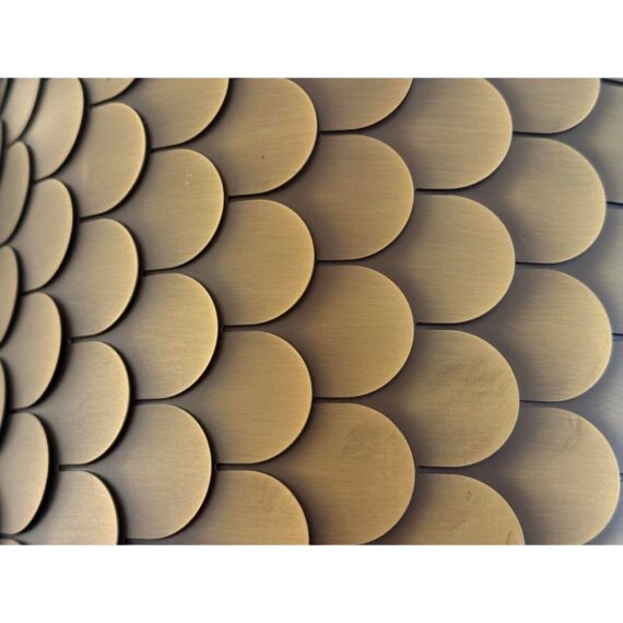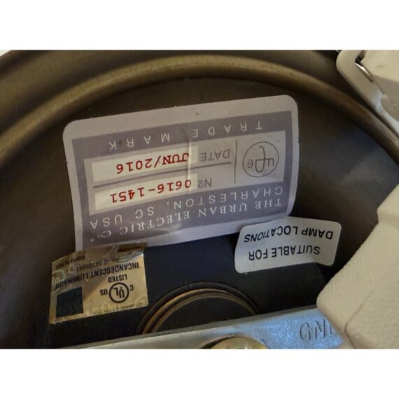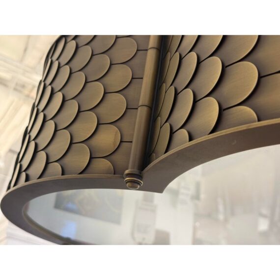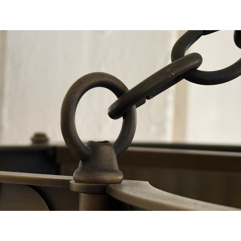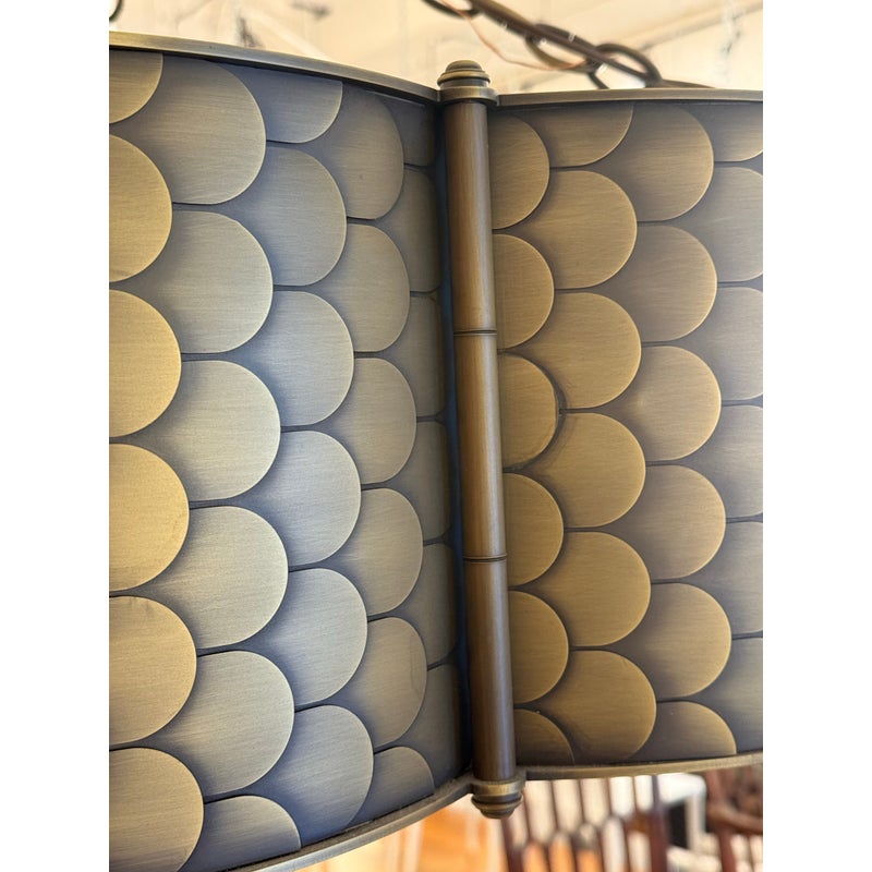 Design Plus Gallery presents the Betty Hang Chandelier from The Urban Electric Company. The Betty Hang is a statement ceiling fixture that brings sculptural presence and layered detail to a wide range of interiors. This chandelier showcases a scalloped circular body wrapped in hand-applied brass scales, creating depth and visual rhythm from every angle. The body and accents are executed in a hewn brass lacquered treatment, paired with an etched glass diffuser that softens the light below. Its combination of metalwork and glass delivers dramatic character while maintaining a timeless sensibility. Minor wear from usage is present, and there is a crack on the glass diffuser. It is in good condition, visible and minimal wear from usage.