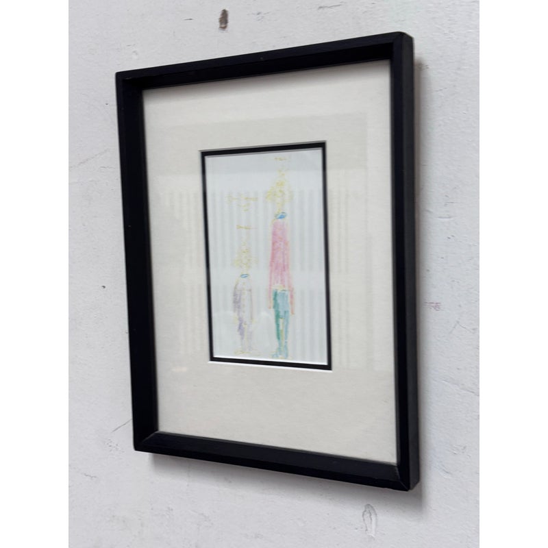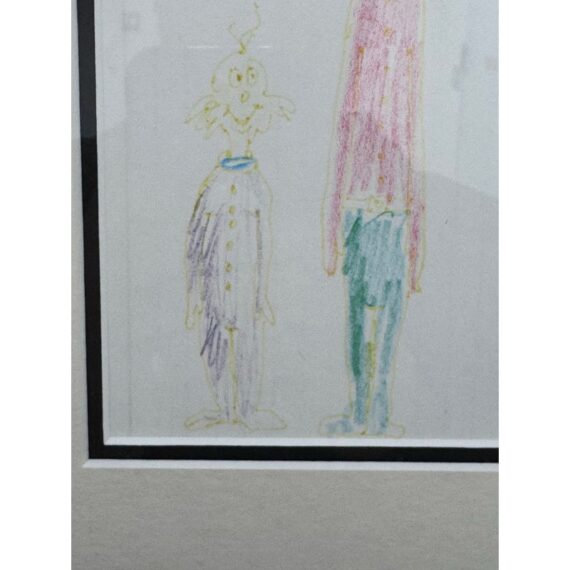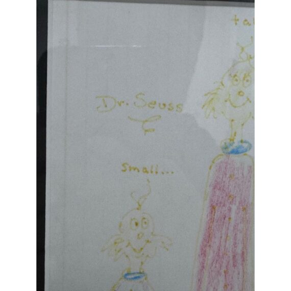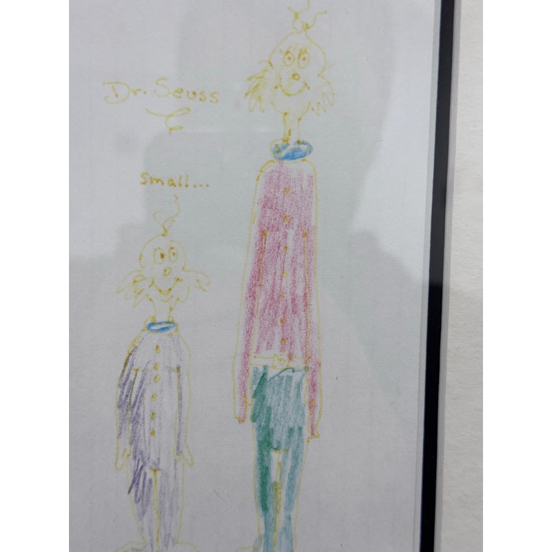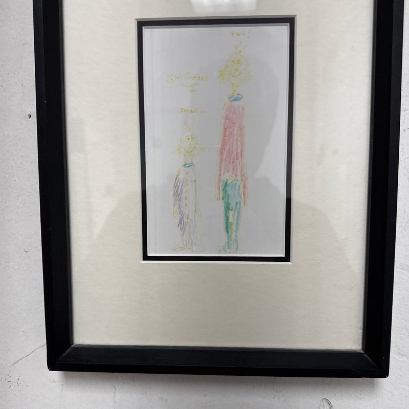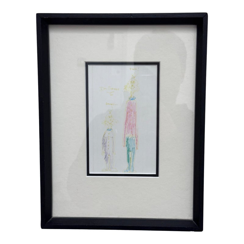 Design Plus Gallery presents an Original Artwork by Theodor Seuss Geisel (Dr. Seuss) titled “Small…Tall” . Two characters rendered in his instantly recognizable hand. The composition contrasts the figures of “Small” and “Tall,” using playful proportions and expressive line work that highlight Seuss’s imaginative approach to character and scale. Executed with colored pencil on paper, the drawing displays gentle age-related wear and slight fading consistent with original works on paper, adding to its authenticity and vintage appeal. The artwork is presented in a custom frame with matting, ready for display and well-suited for collectors of literary art, illustration, or Seuss memorabilia. In good condition, minimal wear.