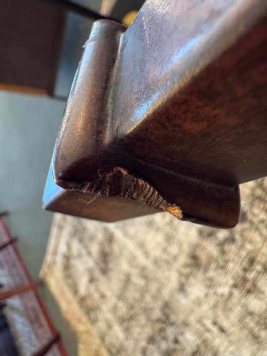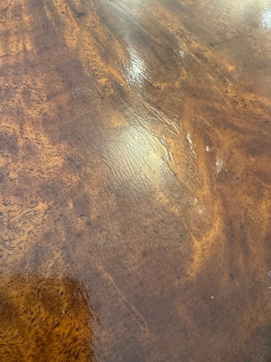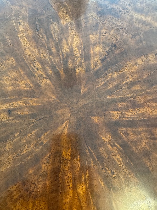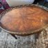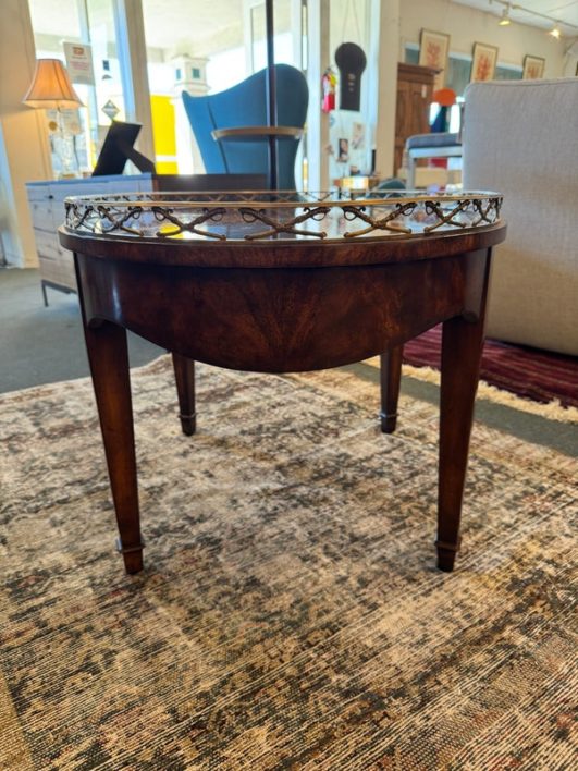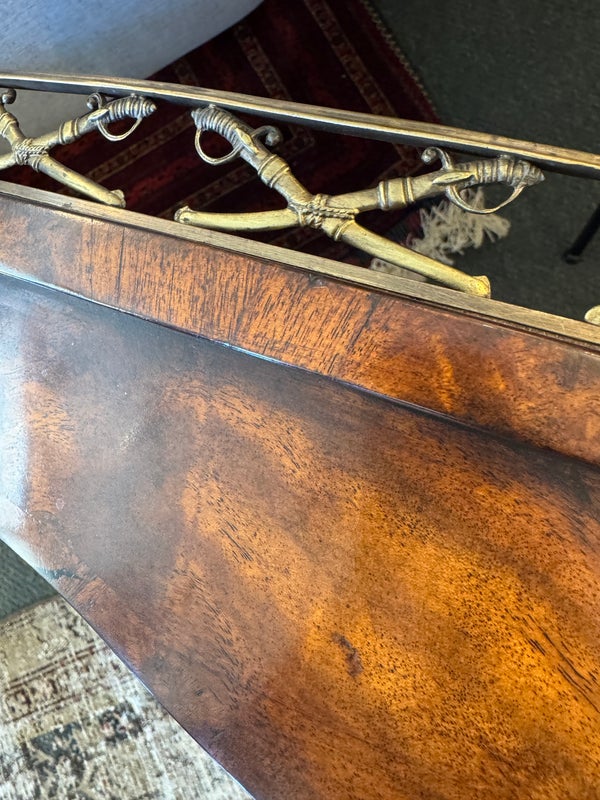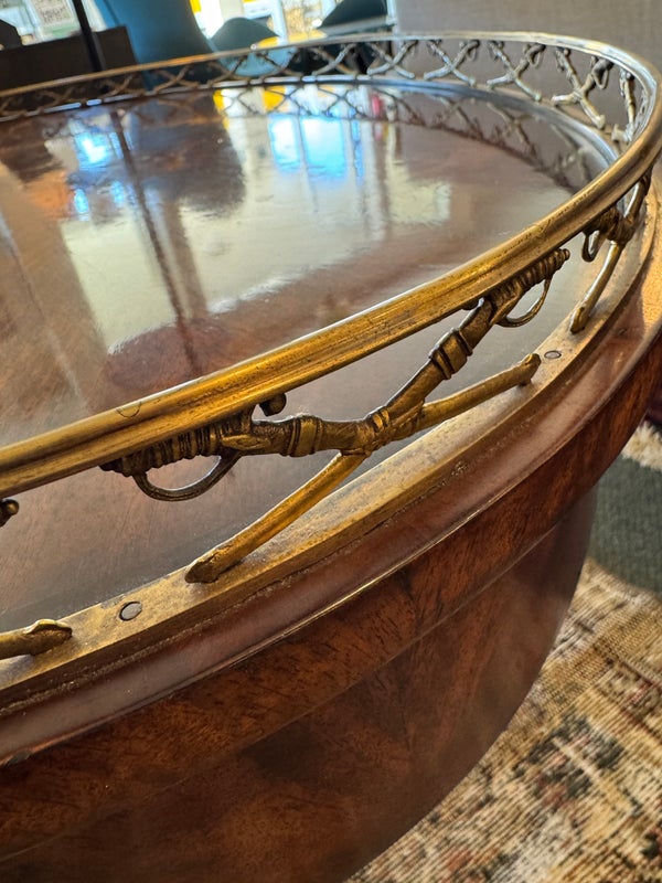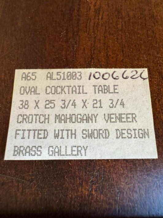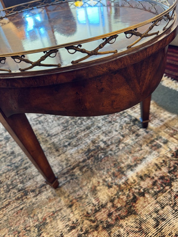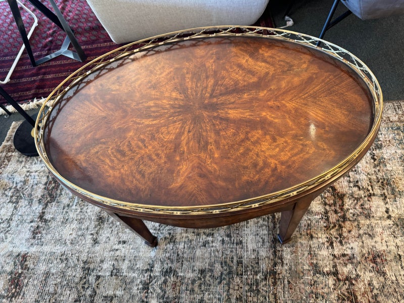 Design Plus Gallery presents the “Althorp” Coffee Table Theodore Alexander. The Admiralty collection with sabre form gallery with an oval crotch mahogany veneer surface. Is in good condition for its vintage age + use.