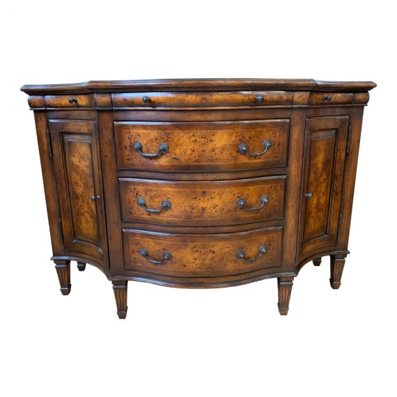Design Plus Gallery presents a Theodore Alexander Curved front Sideboard. Beautiful burled maple wood is contrasted with traditional lines and french inspired curved. Three shallow drawers on top make full use of the form with interior space on top. Three drawers of equal size line the center with open cabinets on the sides holding an optional shelf. Minor wear on frame. Hardware is an oiled brass.