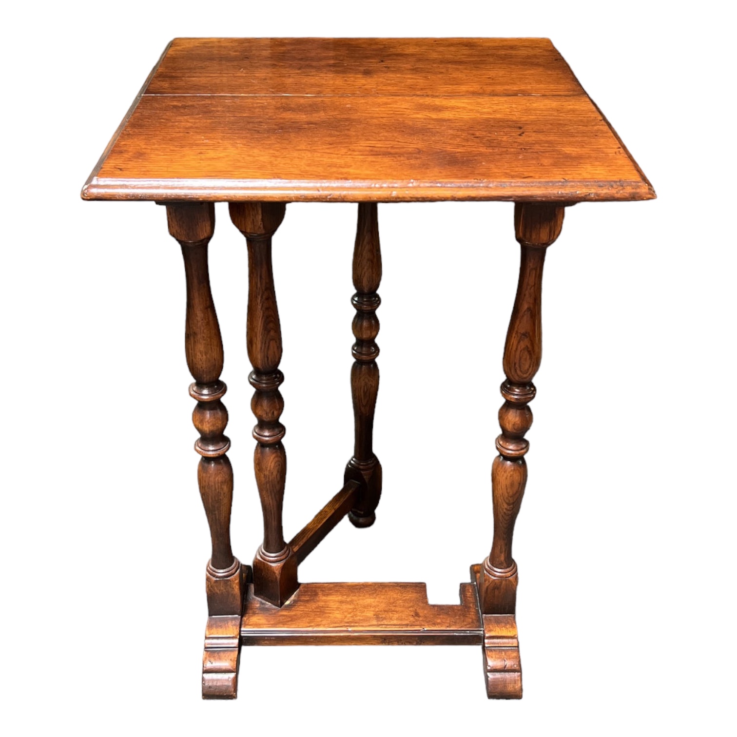Design Plus Gallery presents a Traditional Side Table by Theodore Alexander. Beautiful classic details include turned legs, beveled edges and warm woodgrain finish. The multi functioning, petite silhouette will expand and contract as needed with drop leaf and gate leg function. Visible surface wear; condition is consistent with age and use. Orig.Price $1,075.00