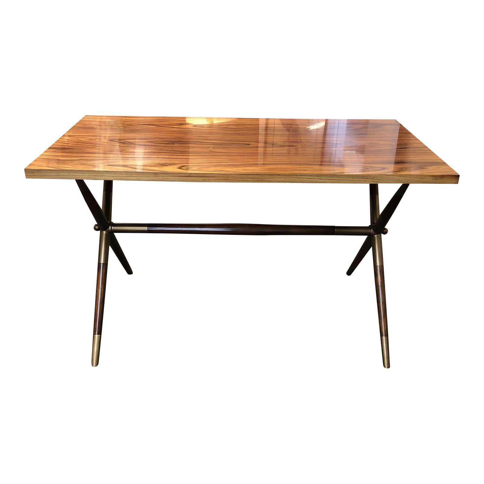 Design Plus Consignment Gallery presents a stunning writing or executive desk from the Keno Bros. Collection for Theodore Alexander. The piece features a beautifully grained veneer surface, mahogany ‘X’ Supports. It references Mid Century Modern with Brass-accented stretcher, legs & top. Twenty nine inch clearance under apron.