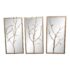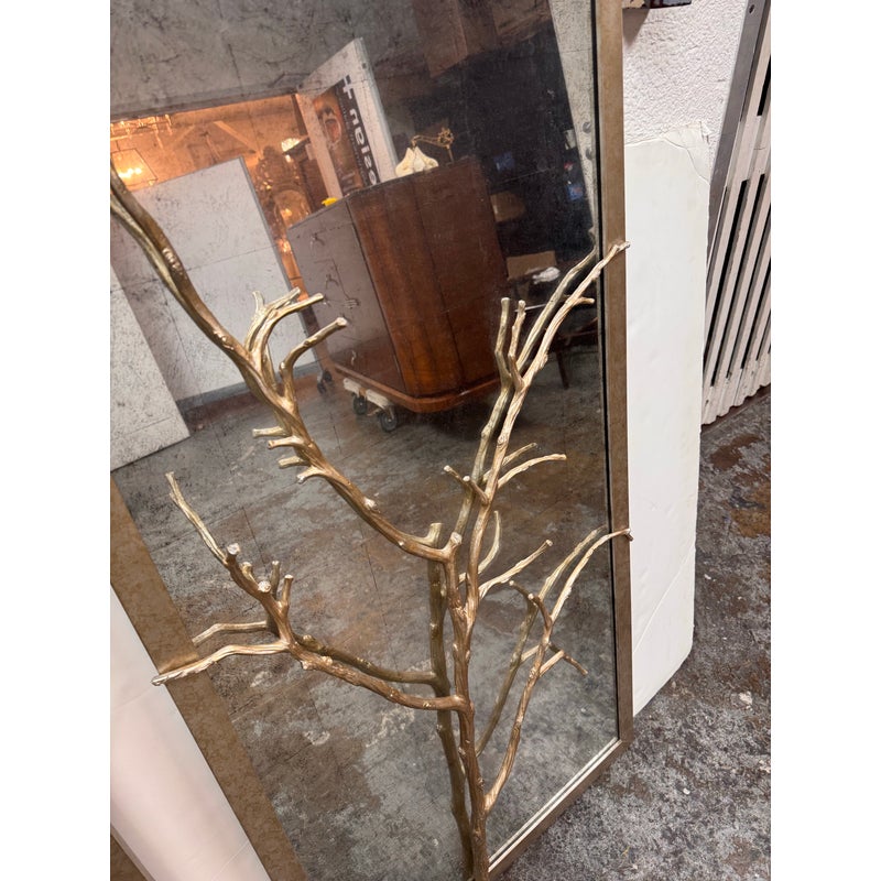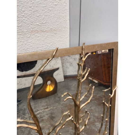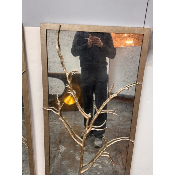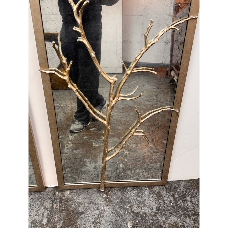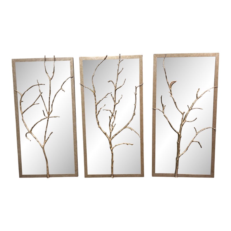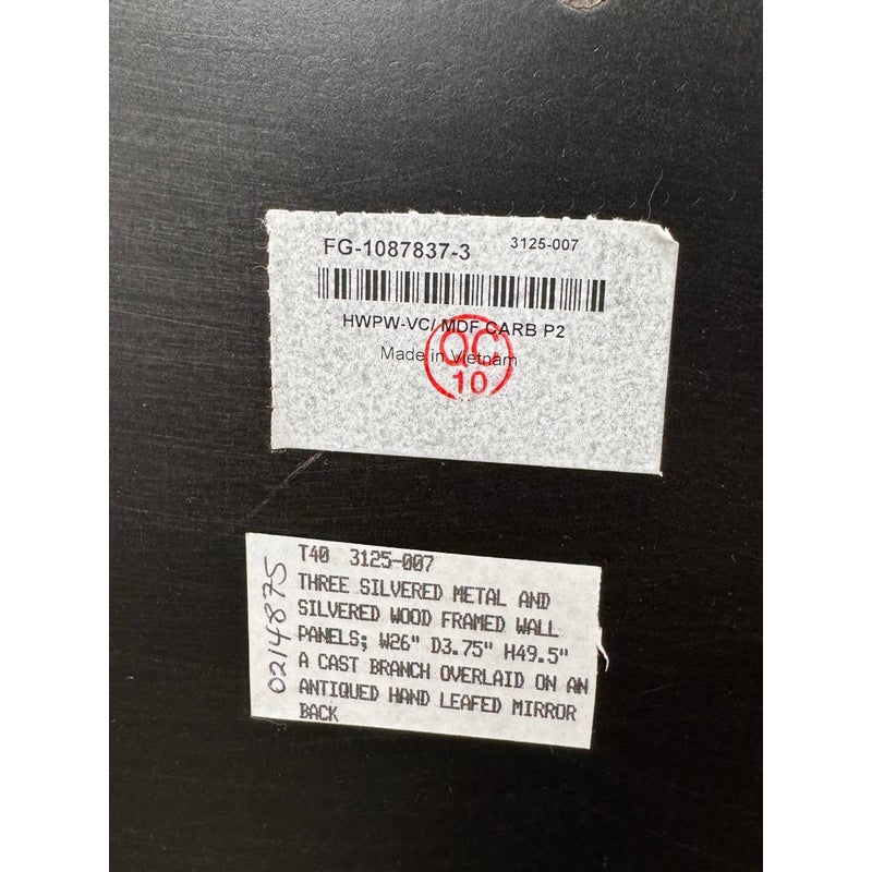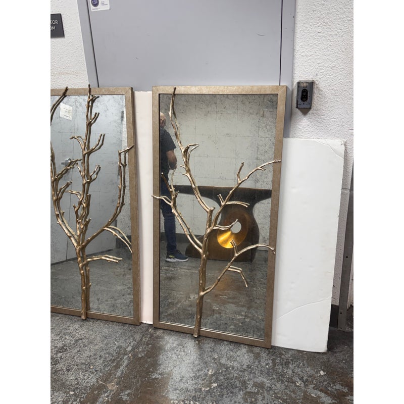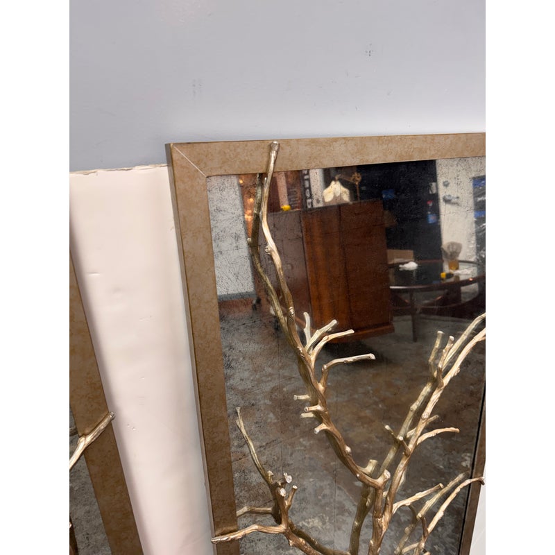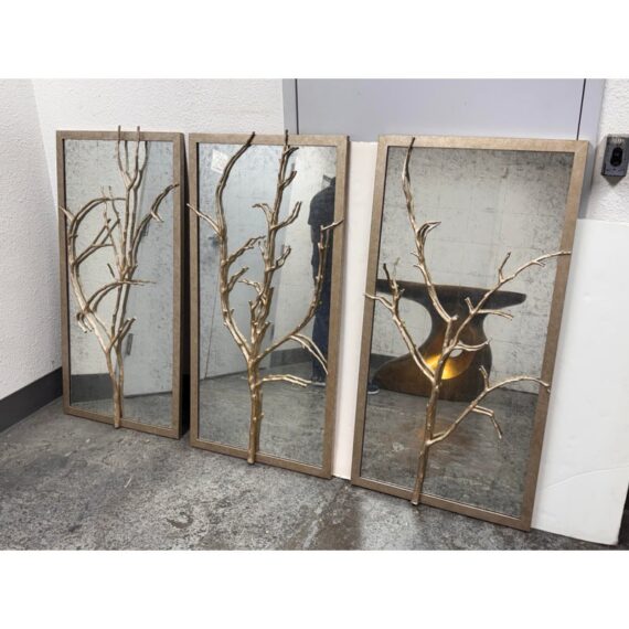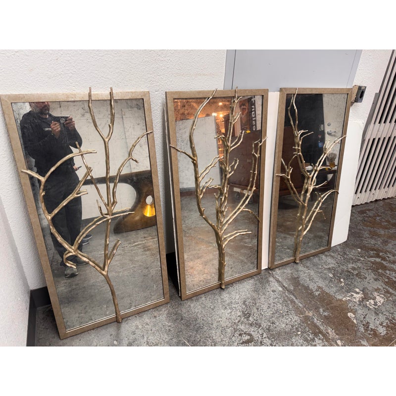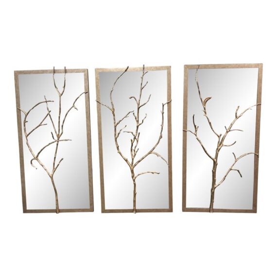 Design Plus Gallery presents the Set of Three Silver Hawthorn Wall Mirrors from Theodore Alexander. The sculptural wall set that merges organic form with architectural balance. Each rectangular panel showcases a silvered metal branch motif overlaid across an antiqued hand-leafed mirror back. It is framed in silver gilt are designed to be displayed together as a cohesive installation. The branch detailing brings a nature-inspired silhouette, while the antiqued mirror backing softens reflections and adds layered character. In good condition, visible and minimal wear from usage.
