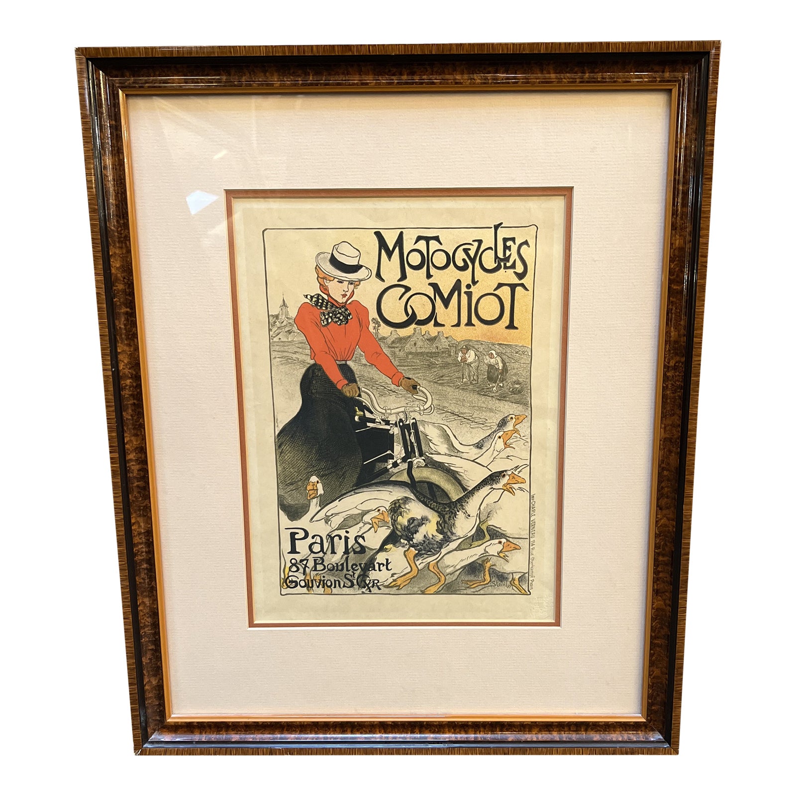 Design Plus Gallery presents a Motocycles Comiot Lithograph by Theophile-Alexandre Steinlen, 1899. The vintage French motorcycle advert depicts frightened geese fleeing the newfangled contraption, rather than the technical details of the machine. Beautiful burl wood frame and double matting protects the blindstamped print.