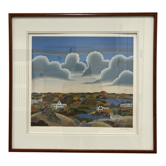 Design Plus Gallery presents the Framed Print by Thomas McKnight. A cityscape shows a peaceful town with cloudy skies, farm fields, homes, and large ponds. The print is double matted inside the frame. Minor wear from use; print is in good condition.