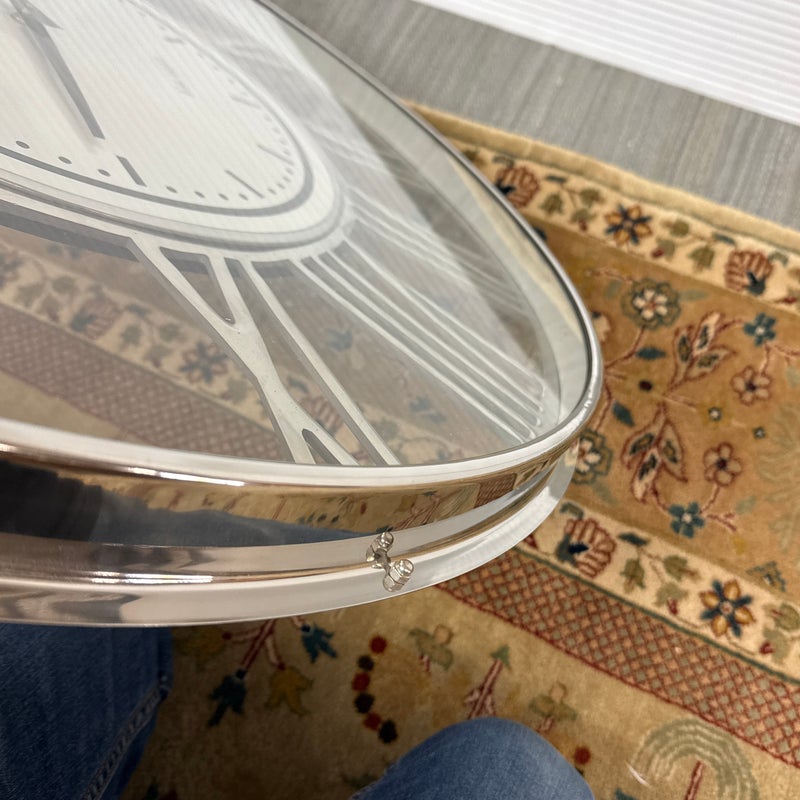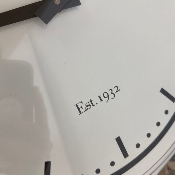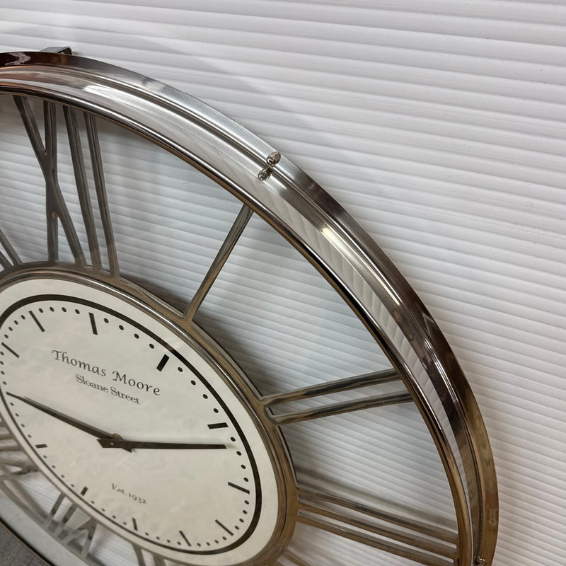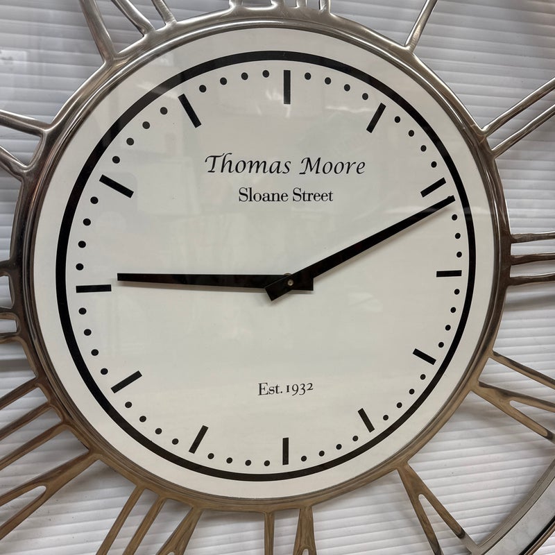Design Plus Gallery presents a Wall Clock from Thomas Moore. The clock is mostly chrome with roman numerals going around the dial. The clock face is white with black tick marks and lettering. It has Thomas Moore written out on top for the brand with Sloane Street beneath. At the far 6 o’clock position it says Est. 1932. The clock looks highly produced but is a rare find. It is in good condition for its usage with minimal signs of wear.