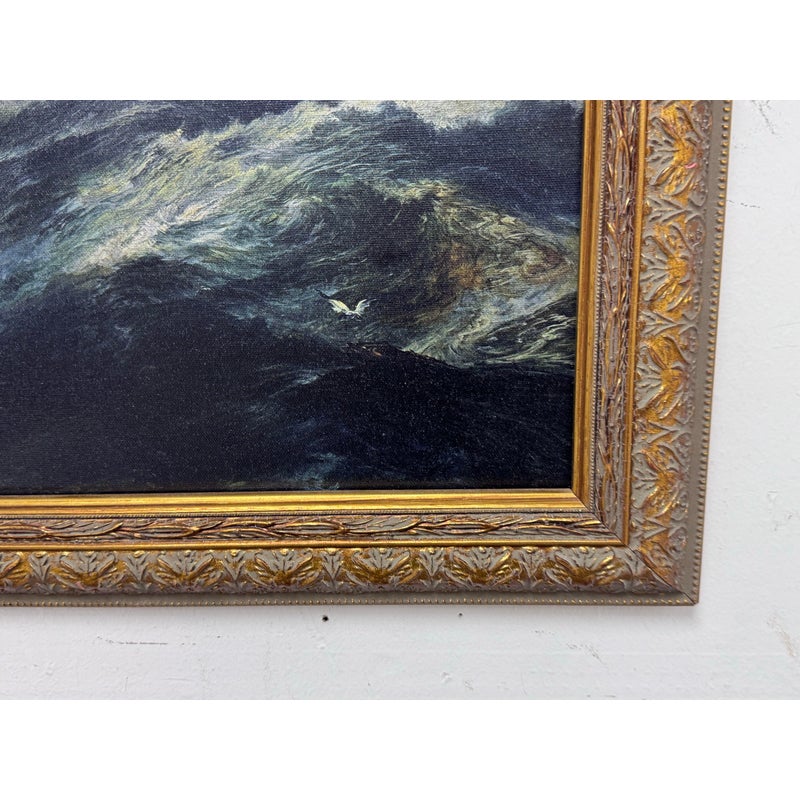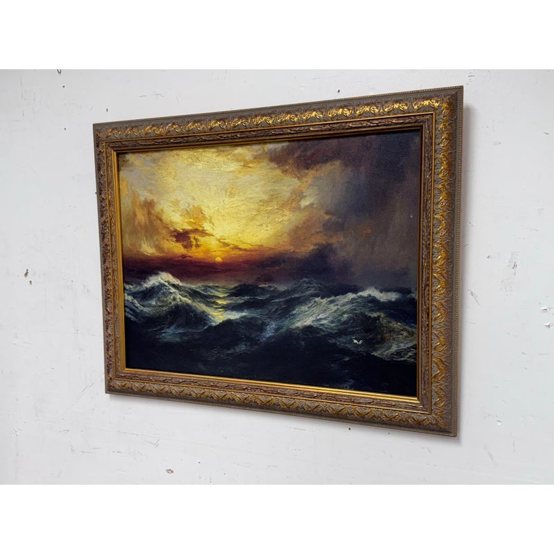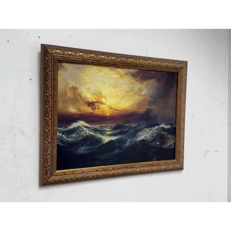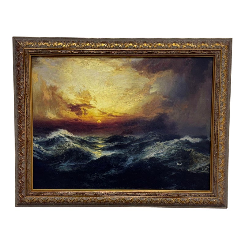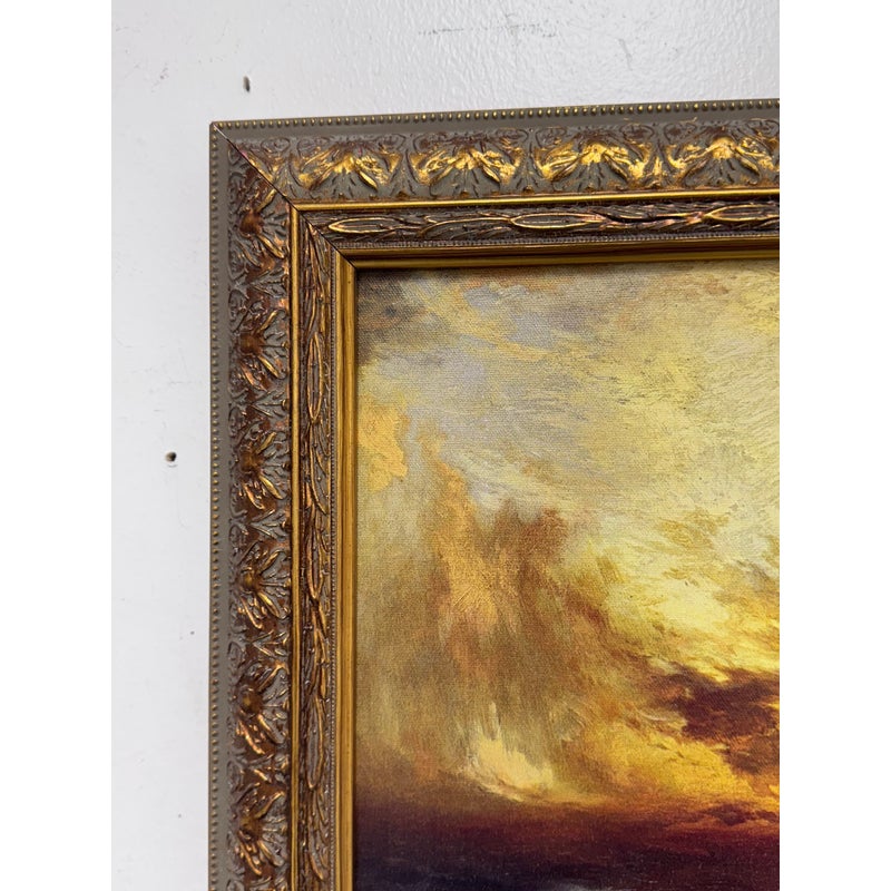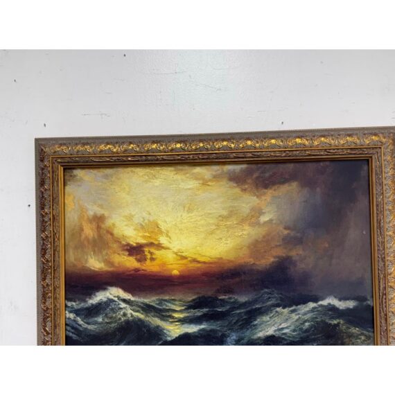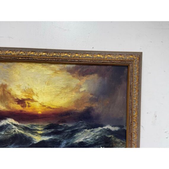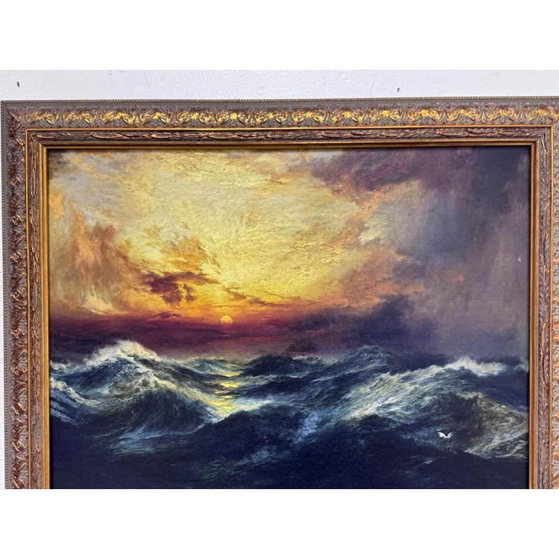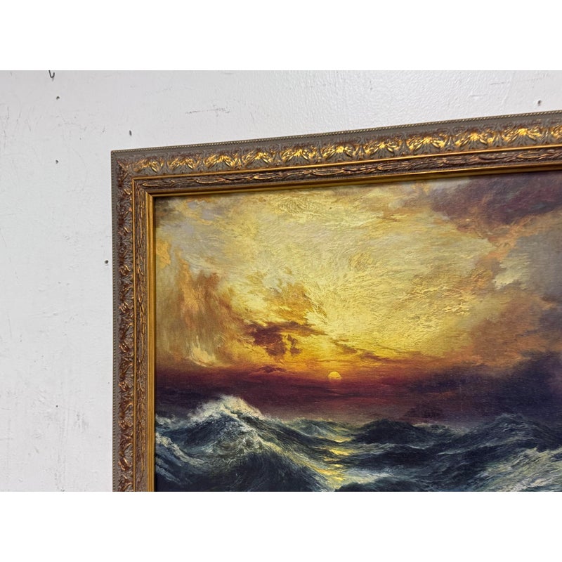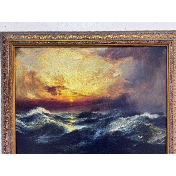 Design Plus Gallery presents a Print of “Sunset After a Storm” Created in 1901 by Thomas Moran. This particular print falls under the marina and cloudscape genres. In the artwork, the sun is depicted setting behind a mass of vivid, towering clouds. The sky is ablaze with shades of gold, orange, and crimson, conveying the remnants of a storm. The waves, painted with great detail, rise and fall with a sense of both tumult and calm, reflecting the golden hues of the sunset in certain crests. The turbulent sea and the glowing sky create a striking contrast, illustrating nature’s raw and awe-inspiring beauty. This magnificent portrayal evokes a sense of tranquillity and majesty, capturing a sublime moment where the storm has left its mark, but peace is beginning to settle over the ocean. Is in good condition for its usage.