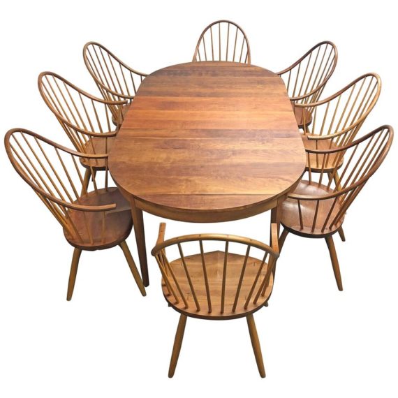 Design Plus Gallery presents a set of eight dining chairs and an oval dining table. The pieces were all hand crafted in the Thomas Moser wood shop in Maine. The chairs were obviously inspired by the classic Windsor chairs. They are impeccably made with the standard of quality we have come to expect from Thomas Moser. Each join is left visible and becomes an integral part of the design. The solid Cherry has been left natural with a matte finish. These are chairs that will make your dinner guests want to linger at the table. Very Comfortable! The Ring oval table comes with two twenty two inch leaves that have their own custom made Flannel carrying cases. Arm height -28 inches. Seat height – 18.5 inches