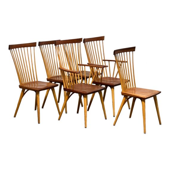 Design Plus Gallery presents a Set of Six ‘Eastward’ Dining Chairs by Thomas Moser. These handmade solid cherrywood and ash chairs include two arm chairs + four side chairs. Each are signed with ‘Thos. Moser Cabinetmakers, 2002 x Patrick A. Parent. Its construction features clean lines, smooth curves, and beautiful wood grain. The backrest is designed with a gentle arc for comfortable support, and the armrests have been ergonomically shaped for a comfortable fit. The arms are reinforced with ash spindles for extra reinforcement and the legs are turned from solid ashwood. The chair is finished with a wax polish to bring out the warm patina and rich color of the cherrywood. The chairs are in good condition, wear consistent with age + use. Made in USA.