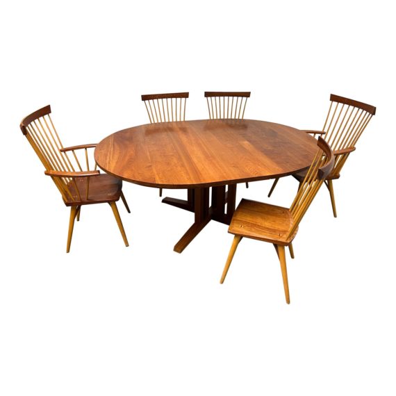Design Plus Gallery presents a Set of Six ‘Eastward’ Dining Chairs + Cherrywood Extendable Dining Table, 2002 for Thomas Moser. These handmade solid cherrywood and ash chairs include two arm chairs + four side chairs. Each are signed with ‘Thos. Moser Cabinetmakers, 2002 x Patrick A. Parent. Its construction features clean lines, smooth curves, and beautiful wood grain. The backrest is designed with a gentle arc for comfortable support, and the armrests have been ergonomically shaped for a comfortable fit. The arms are reinforced with ash spindles for extra reinforcement and the legs are turned from solid ashwood. The chairs are finished with a wax polish to bring out the warm patina and rich color of the cherrywood. The chairs surrounds the Cherrywood Extendable Eco Dining Table. The pedestal base features shaker style slats, while the smooth table top provides a perfect surface for everything from meals to board games. This table exemplifies the Moser design philosophy, with aesthetics predicated on function and ornamentation derived from the furniture’s exposed architecture and the translucent richness of the wood itself. The durable hand finish reveals every inch of the wood’s natural grain, and welcomes a lifetime of memorable gatherings. The chairs + table are in good condition, wear consistent with age + use. Made in USA.