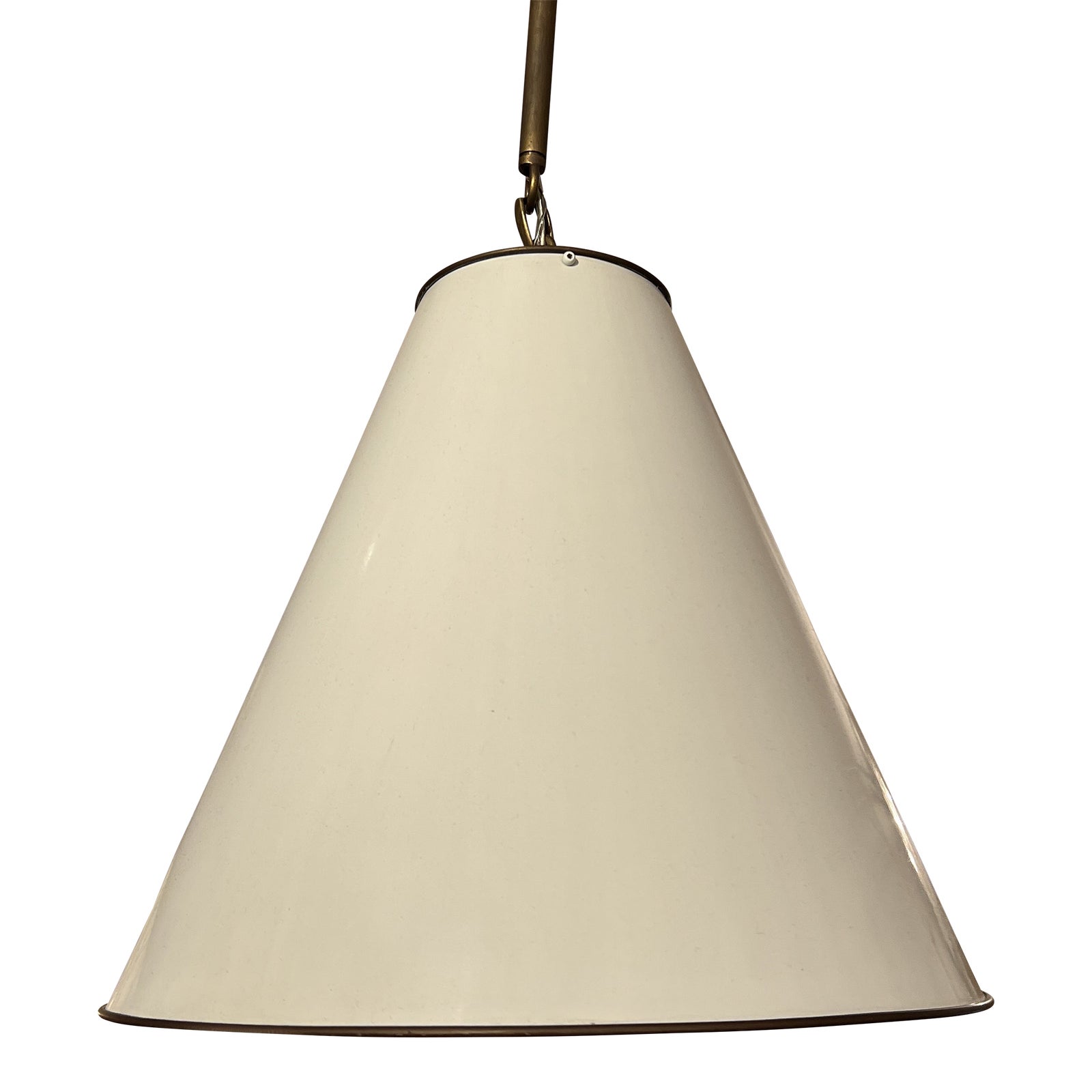 Design Plus Gallery presents Thomas O’Brien Visual Comfort Goodman Small Hanging Light. Conical brass shade is powder coated a fresh white on the outside. Coordinating canopy and bars are semi adjustable with two length options. There is minor wear through out, pendant is in good condition.