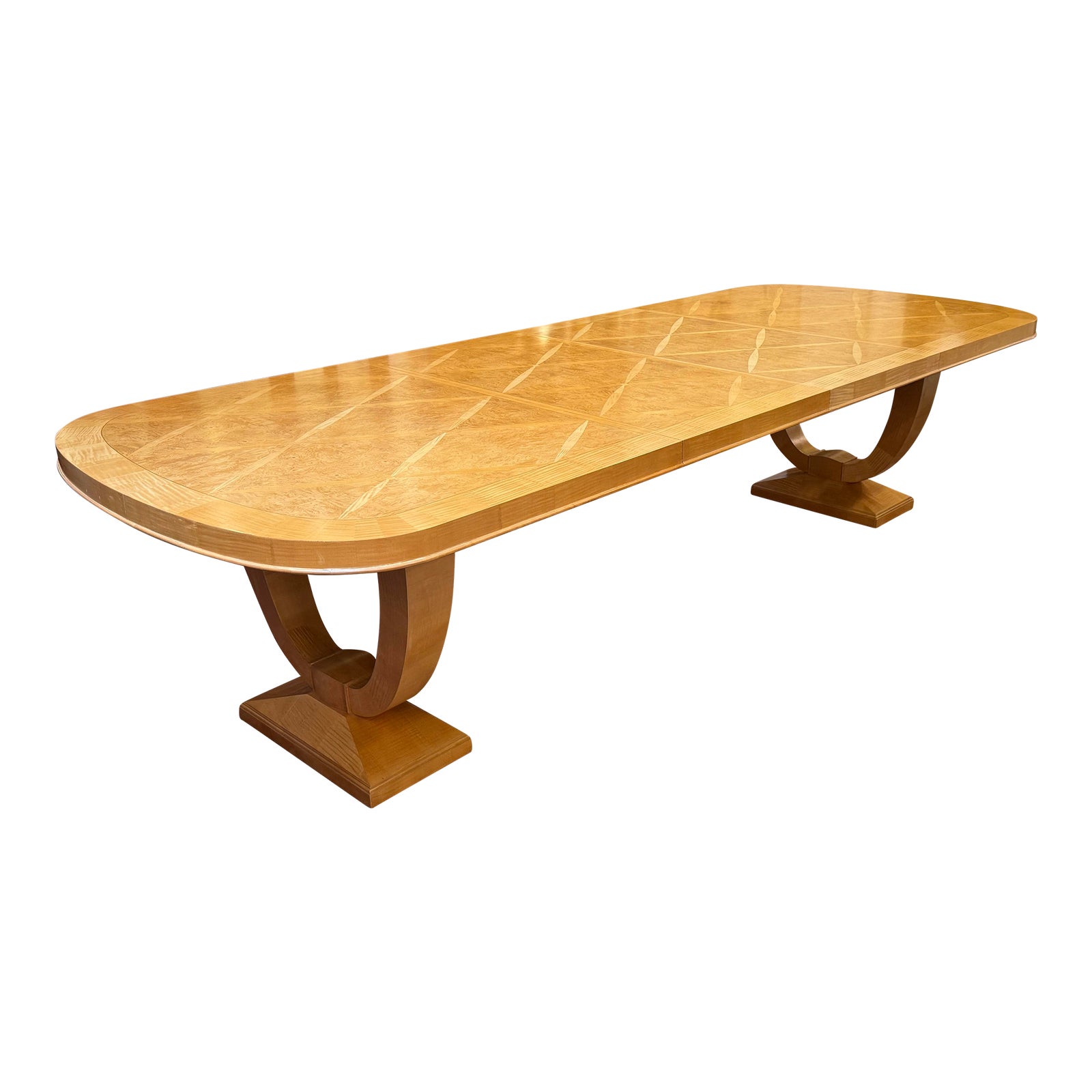Design Plus Gallery presents a Bogart Luxe Dining Table by Thomasville. Rarely found in the blond finish, this beautiful table features inset burled wood, curved double pedestal and banded racetrack silhouette. Two 24 inch leaves extend the elegance to seat your whole crowd. Light surface wear; condition is good for age and use.