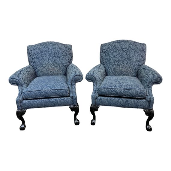 Design Plus Gallery presents a Pair of Vintage Arm Chairs by Thomasville. Classic English silhouette with camelback, rolled arms and carved feet, the pair of chairs are timeless. A lively blue leaf damask upholstery wraps each chair, outlined in set welting. Carved feet are contrasted in antiqued black finish. Light evidence of wear; condition is consistent with age and use.
