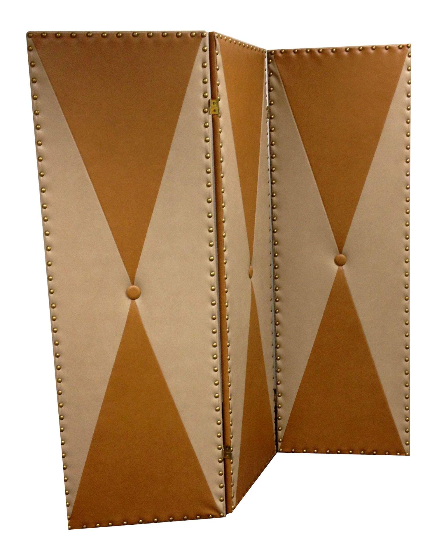 Design Plus Gallery brings us this brand new three panel screen in a Mid-Century Modern diamond motif. Two toned leather with brass nail heads. The perfect piece to help you create different areas in your living space.
