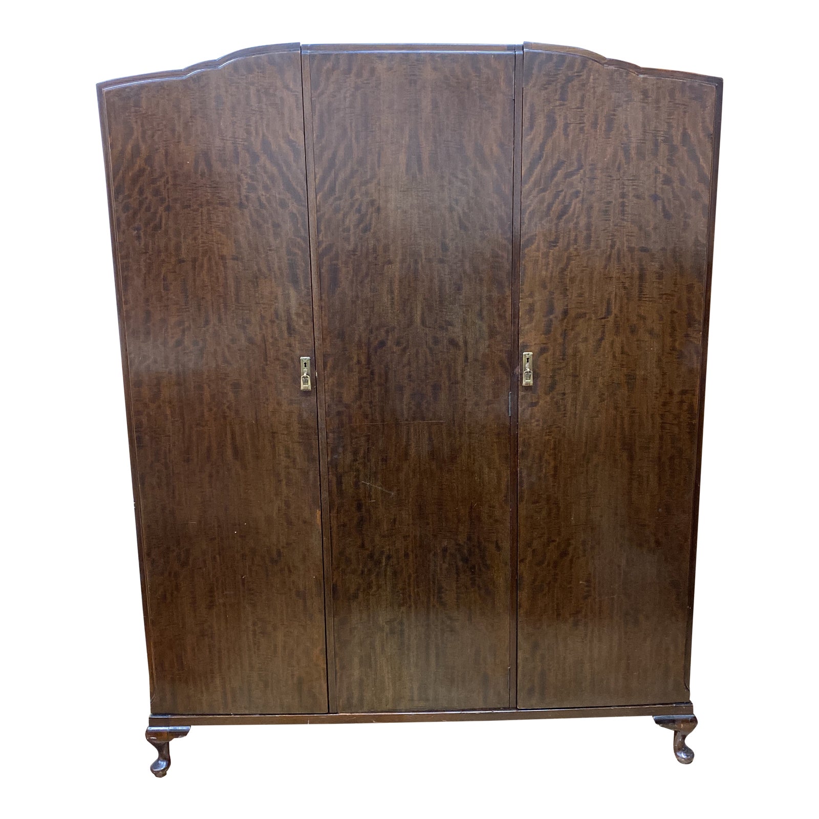 Design Plus gallery presents a Early 20th Century Three Piece Tiger Flame Armoire. Wood grain is cut in a way to showcase the marbling of the wood. Dark stain adds a richness and depth to the large Deco storage unit. Double doors on left open to reveal one shelf with two clothing rods. Door on far right opens with drawers at base and smaller hanging space above. Mirror is mounted on the interior of the door. Cabriole legs give slight life for the unit Oiled brass pulls adorn the doors and the original key is missing. Visible wear due to age.