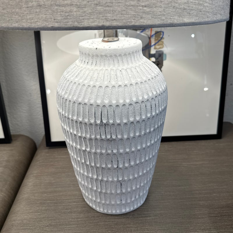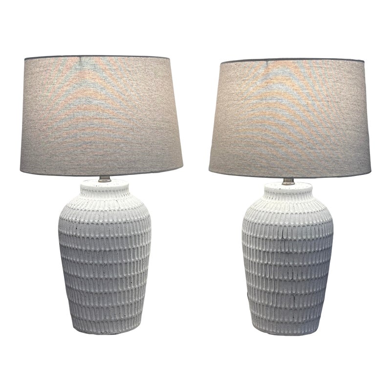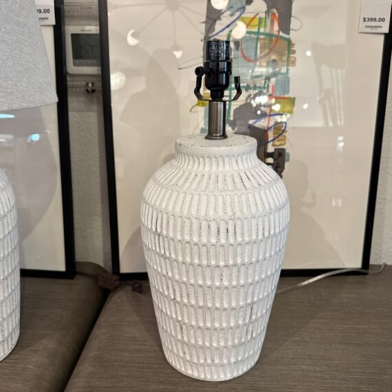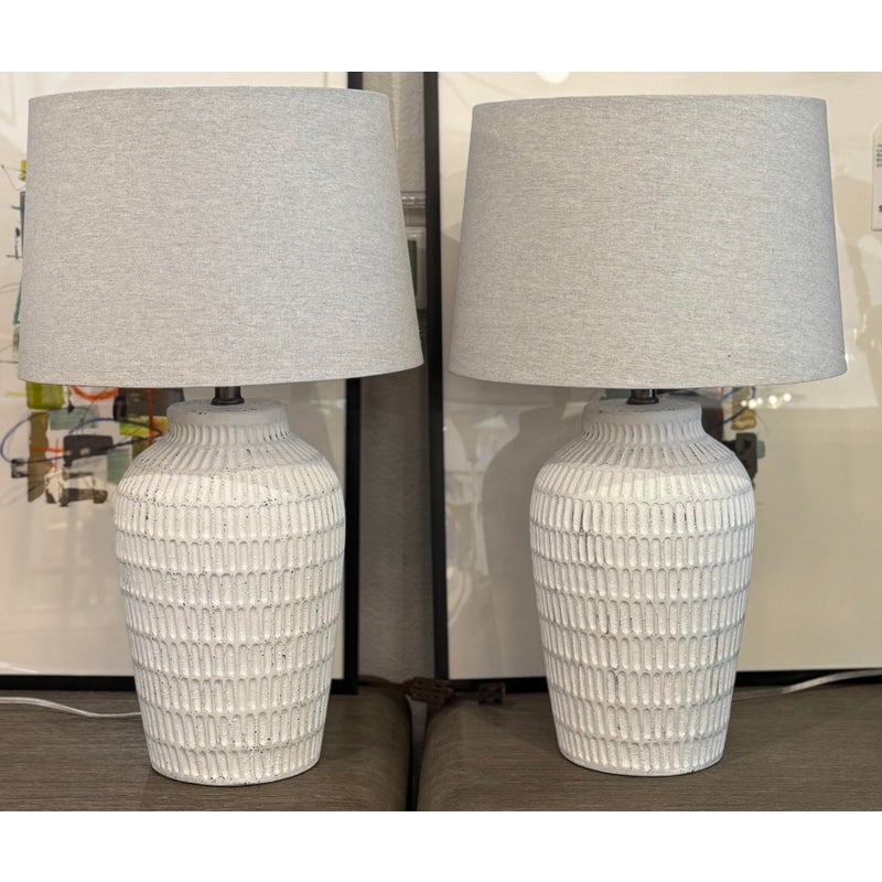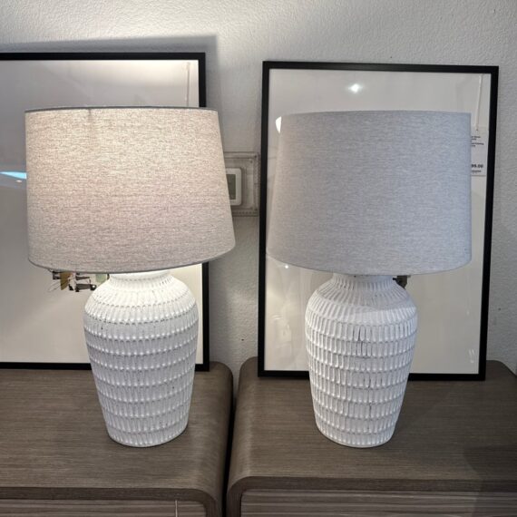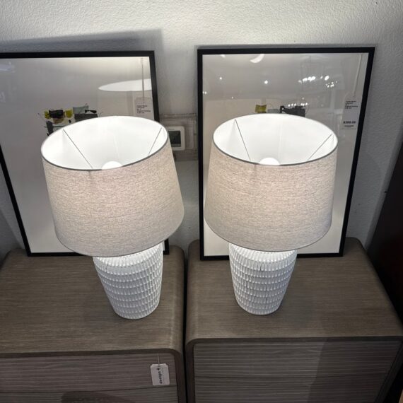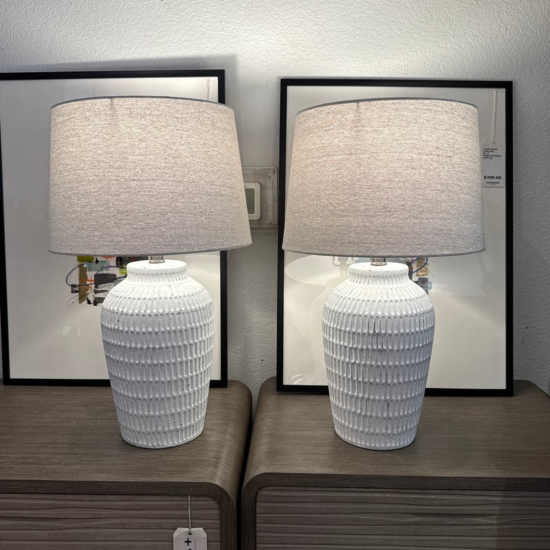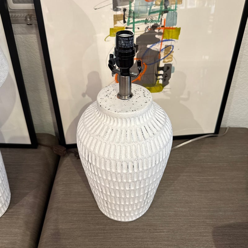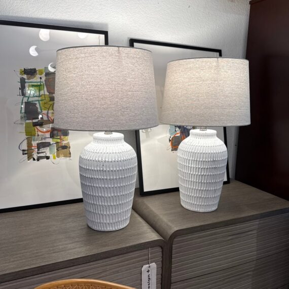 Design Plus Gallery presents a Pair ofCeramic Textured Table Lamps by Threshold. These ceramic table lamps make a great addition to your indoor lighting. It features a textured base in a painted white finish to add a touch of design and fresh flair. The one-way light setting allows for easy operation so it’s simple to turn on and off. In good condition, minimal wear form usage.