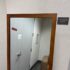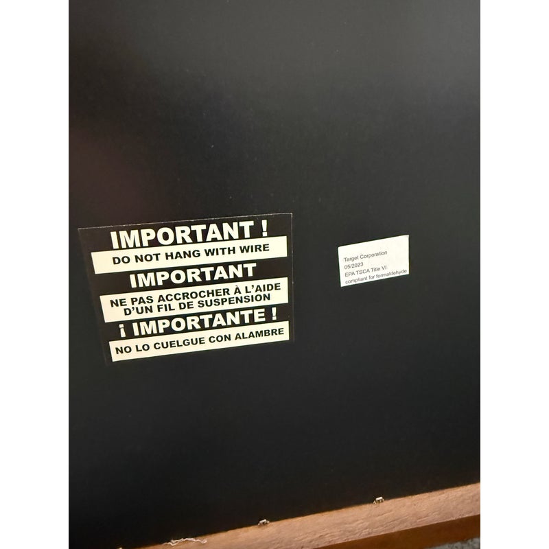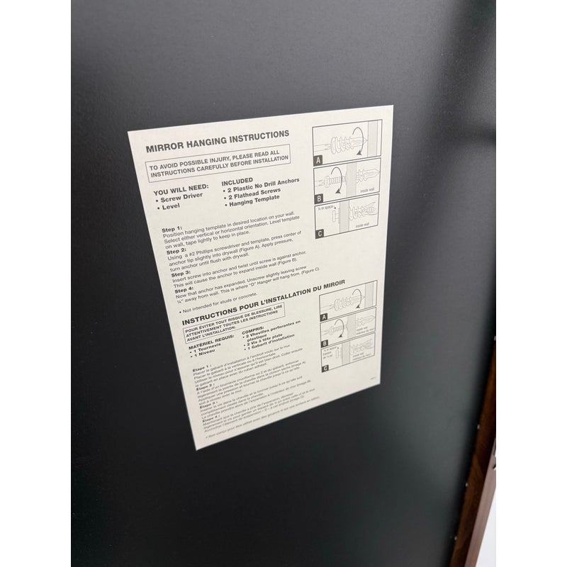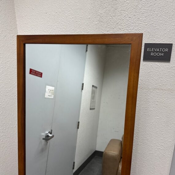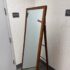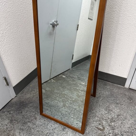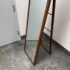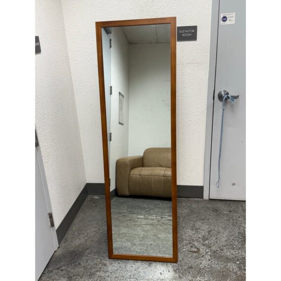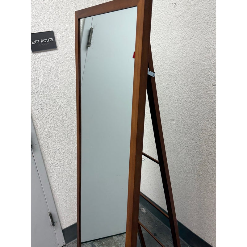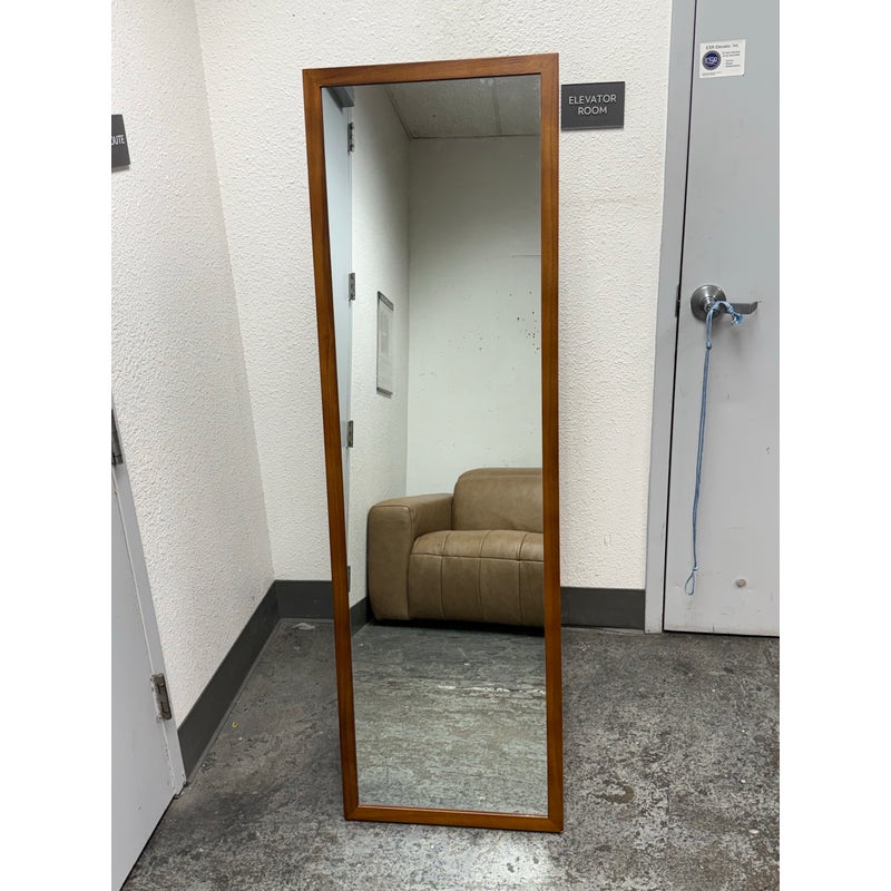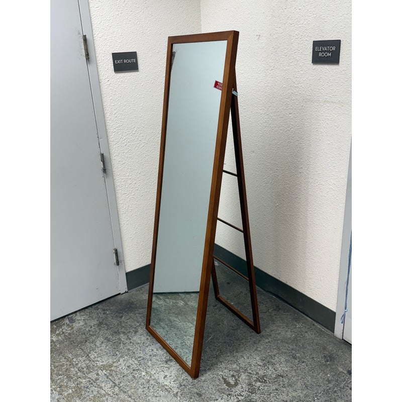 Design Plus Gallery presents a Wooden Mirror from Threshold. The full-length mirror pairs a slim rectangular profile with a wood frame and rear ladder support for hanging your belongings. Angled construction and open crossbar detailing give the piece a casual modern character, while the natural wood tone adds visual depth to the overall form. This mirror is in good condition with visible and minimal wear from usage.