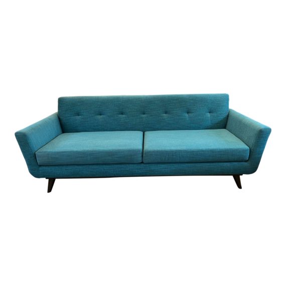 Design Plus Gallery presents the Fillmore Sofa by Thrive Home. Elevated on dark-stained tapered legs, the variegated turquoise linen blend upholstered sofa adds an immediately recognizable aesthetic. Lightly tufted fixed back over a pair of foam seat cushions. Directly influenced by mid-century designers and produced domestically, Thrive’s eco-friendly process includes “ensuring the responsible harvesting of the wood used” in their furniture. Made in the USA. Light evidence of wear; overall good condition.