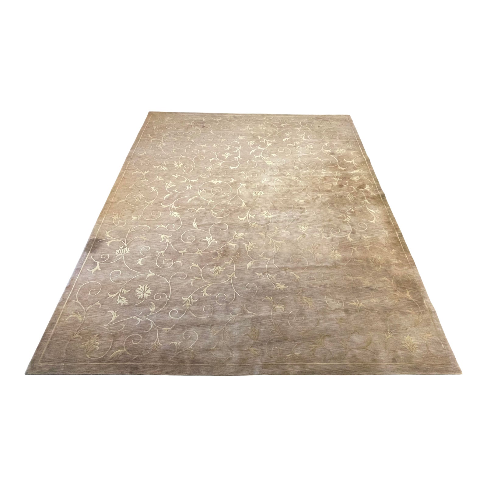 Design Plus Gallery presents a 12ft x 15ft Tibetan Wool + Silk Mauve + Champagne Rug. Multi pile construction is hand made with a heathered mauve background. A modern and large scale botanical silhouette dances on top in a raised champagne silk. Minor wear through out, good condition overall.