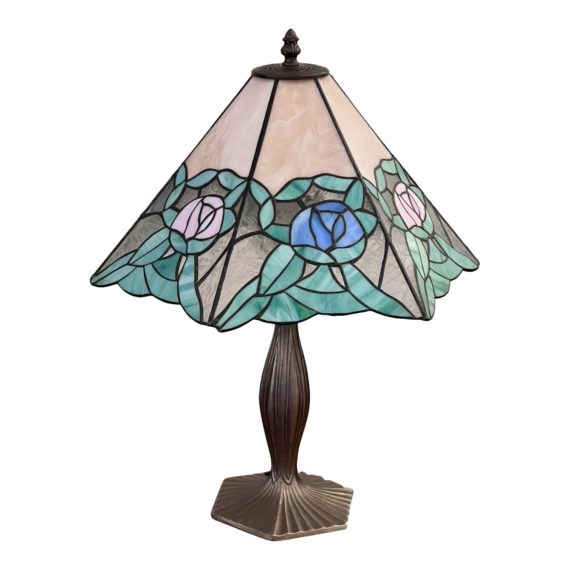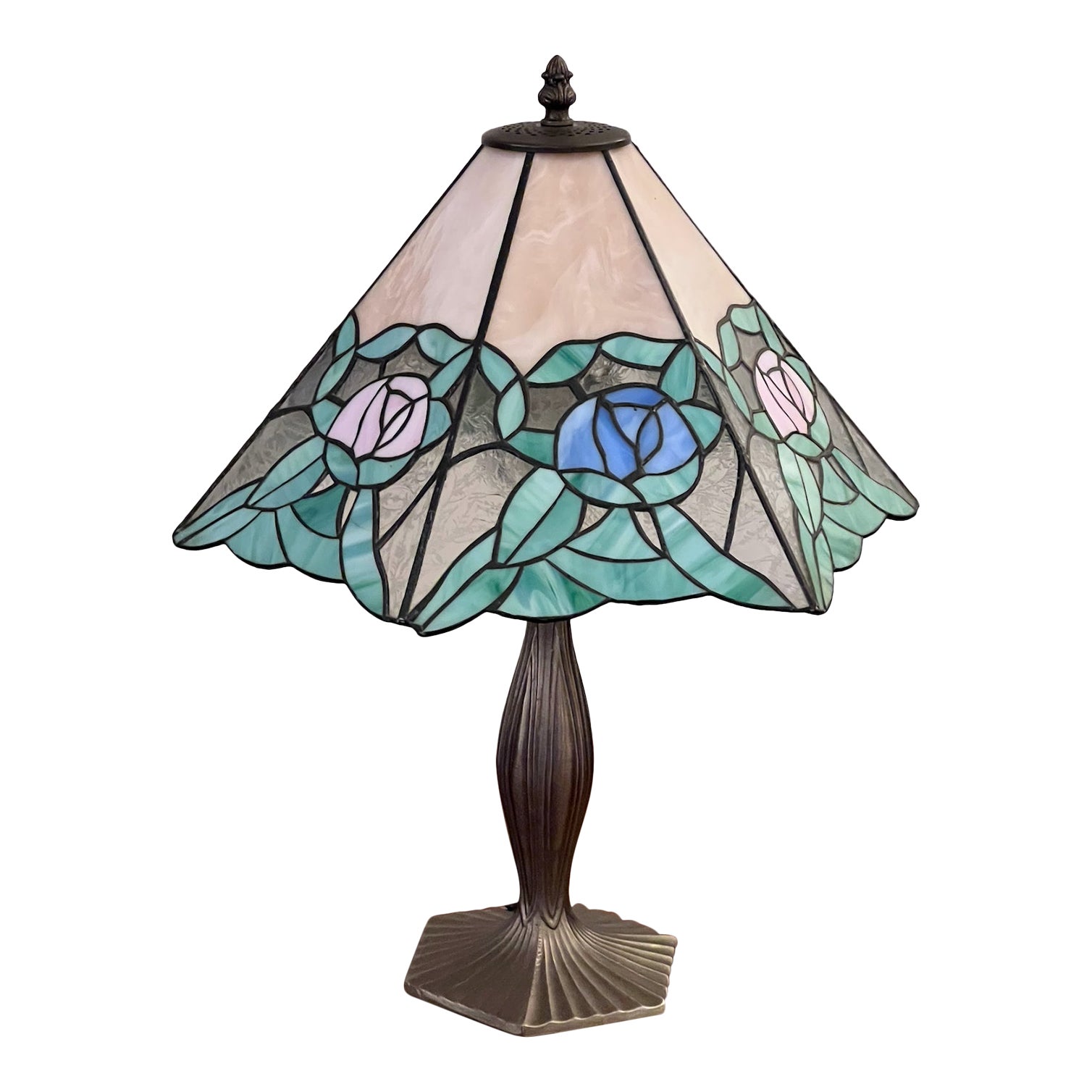 Design Plus Gallery presents a Stained Glass Table Lamp in a Tiffany Style. Metal base with elegant pattern work to resemble a flower stem. The shade is of stained glass and has blue and pink flowers between the green leaves. In good vintage condition, with wear that is consistent with its age + usage.