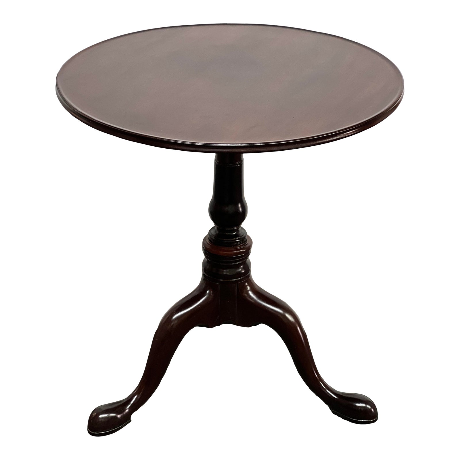 Design Plus Gallery presents a Tilt Top Round Side Table. Constructed with wood. The table has a raised edge round top that rests on a three-legged pedestal. The legs are curved, and the pedestal is cylindrical with varying thickness. The top can tilt after releasing a mechanism for ease of storage. Minor wear consistent with age + use; table is in good condition.