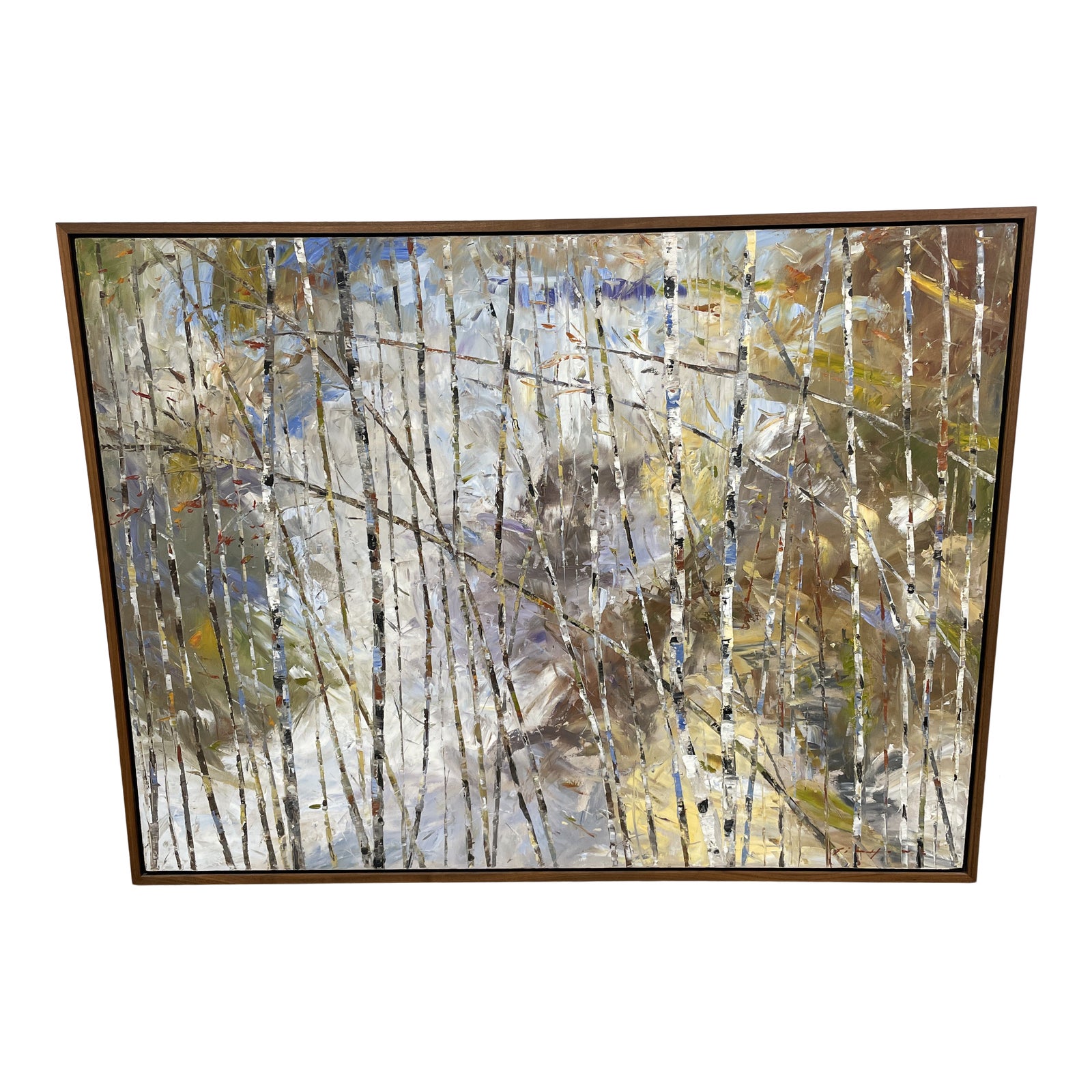 Design Plus Gallery presents a Tim Howell ” The Glory of Aspens” Original Acrylic Painting. Acrylic paint is masterfully blended and layered with a palette knife and brush in a warm + transitional fall palette. Impressionistic birch trees are layered with a dynamic background full of movement. Custom framed with a complementary umber wood perimeter in a floating fashion. Back of the painting is signed and titled by the artist. Little evidence of wear, art piece is in good condition.