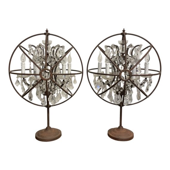 Design Plus Gallery presents a Pair of Timothy Oulton for Restoration Hardware Foucault Crystal Orb Table Lamps. Influenced by 19th-century physicist Leon Foucalt’s gyroscope with the iron double gimbal frame. Interior encapsulates enchanting six arm crystal chandeliers. Antiqued tone bestows a look of age on the iron. Compatible with dimmer switches and comes with dimmers on the cords. One of the table chandeliers is missing 14 crystals and the other is missing 10. Table chandeliers are in good condition.