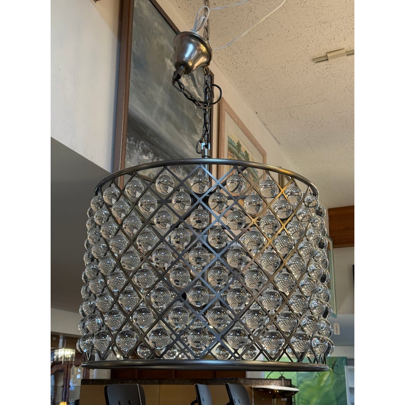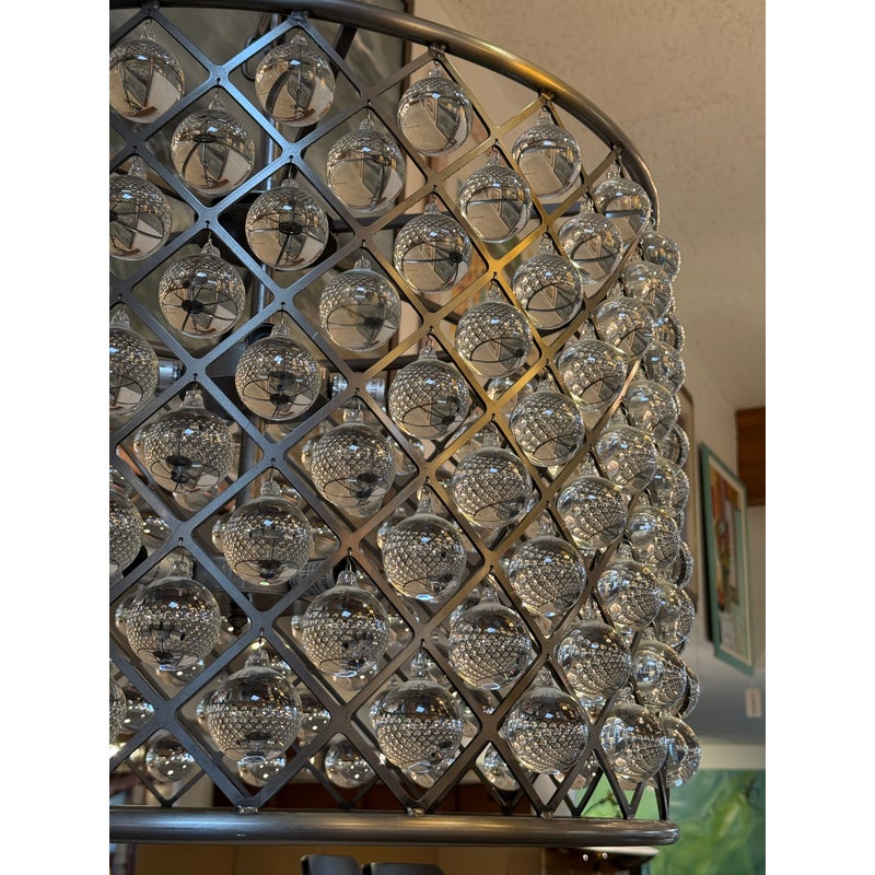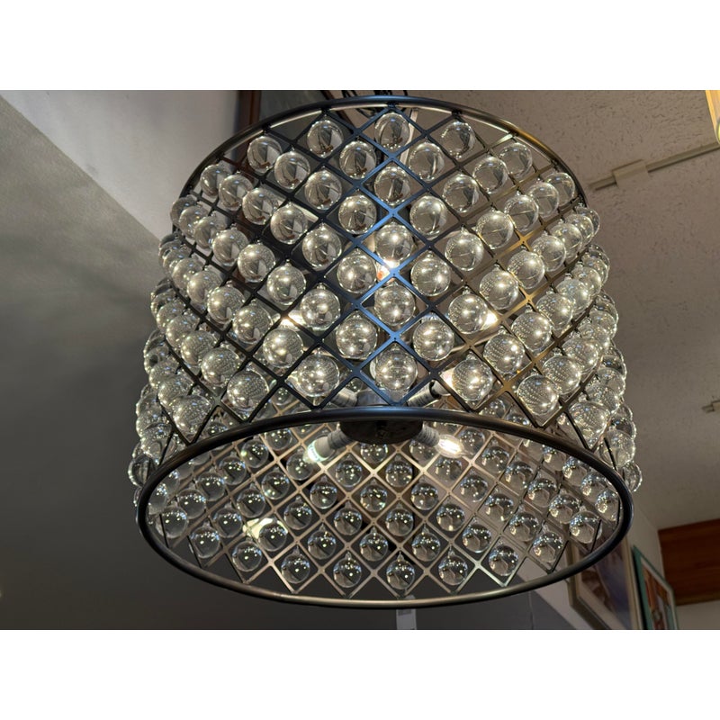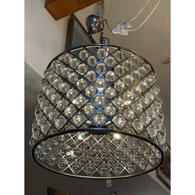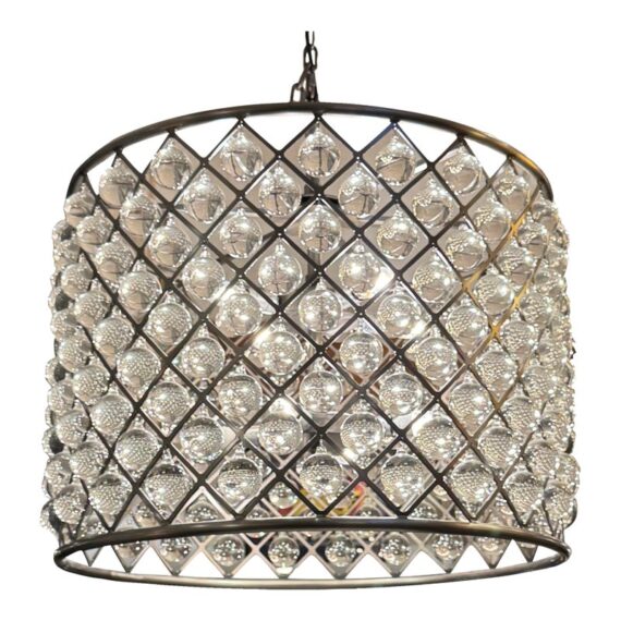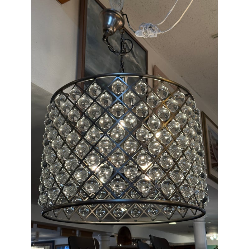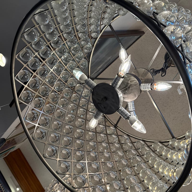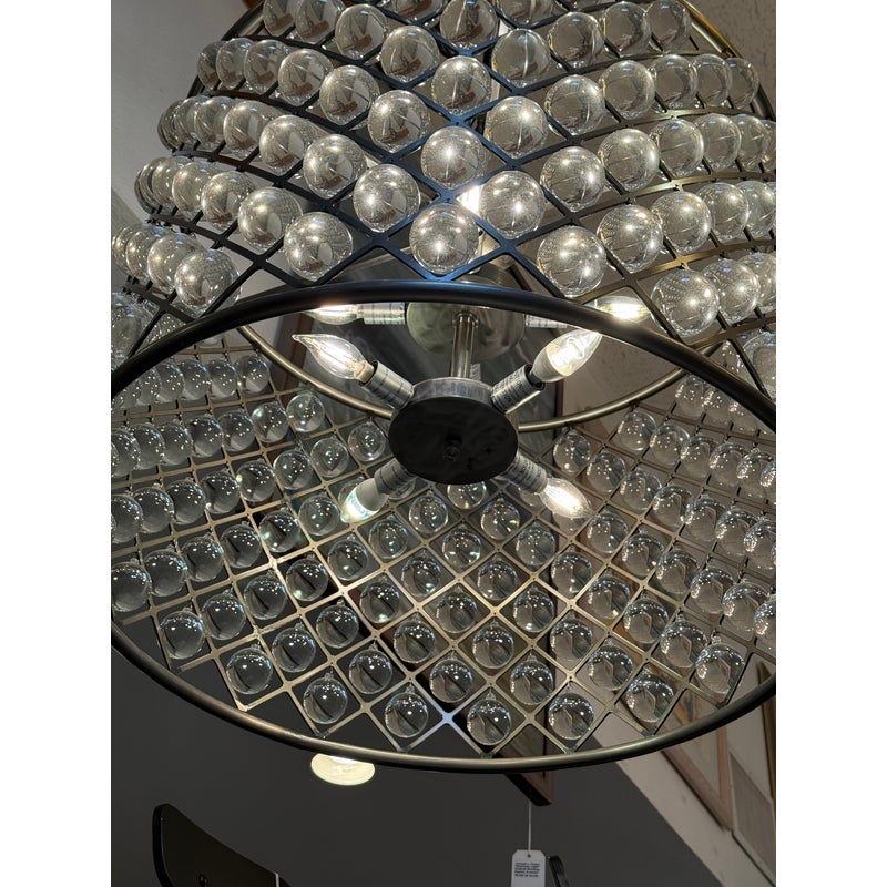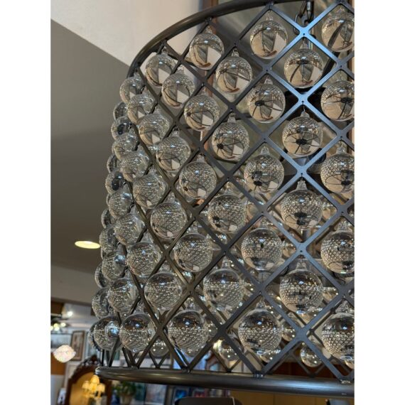 Design Plus Gallery presents the Spencer Hoop Chandelier by Restoration Hardware. Designed by Timothy Oulton, the Spencer’s crystal glass spheres reflect eight candelabra bulbs like gems within its black forged iron grid. In good condition, minimal wear.