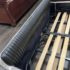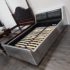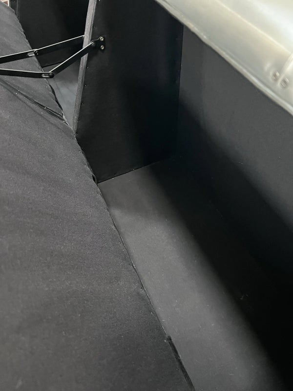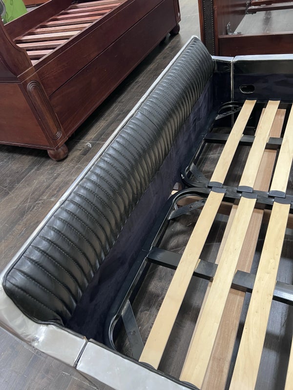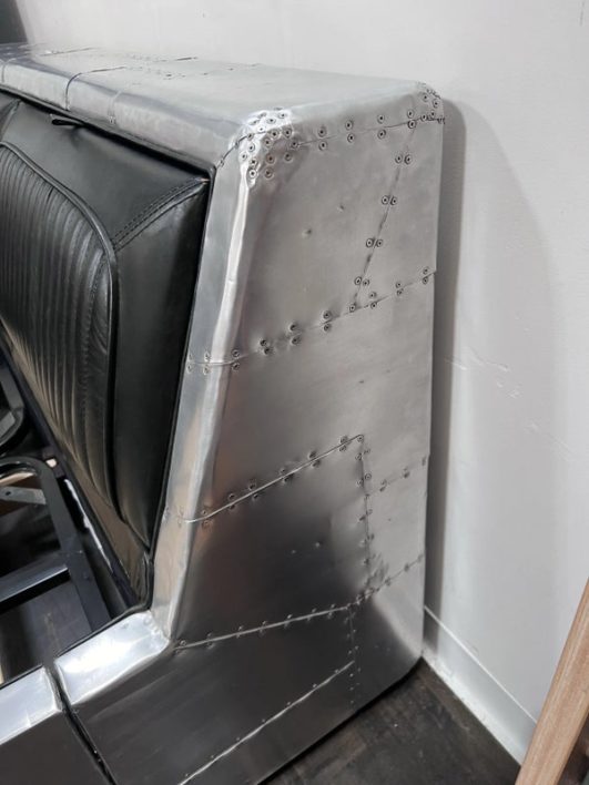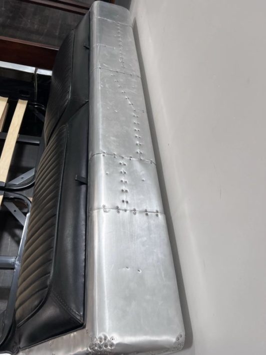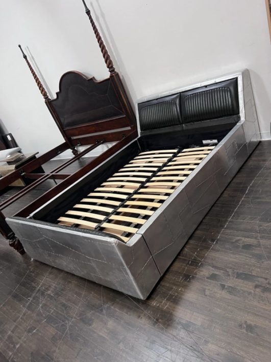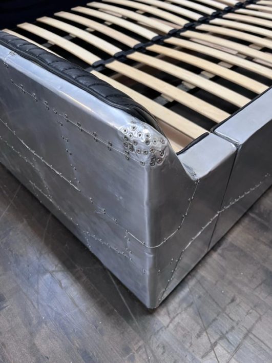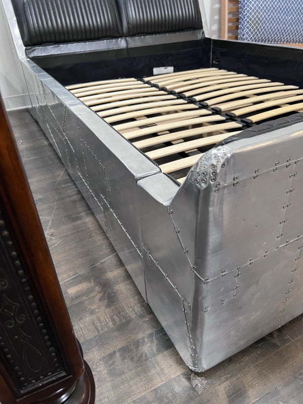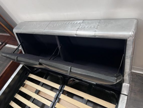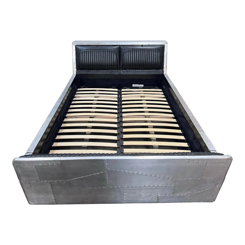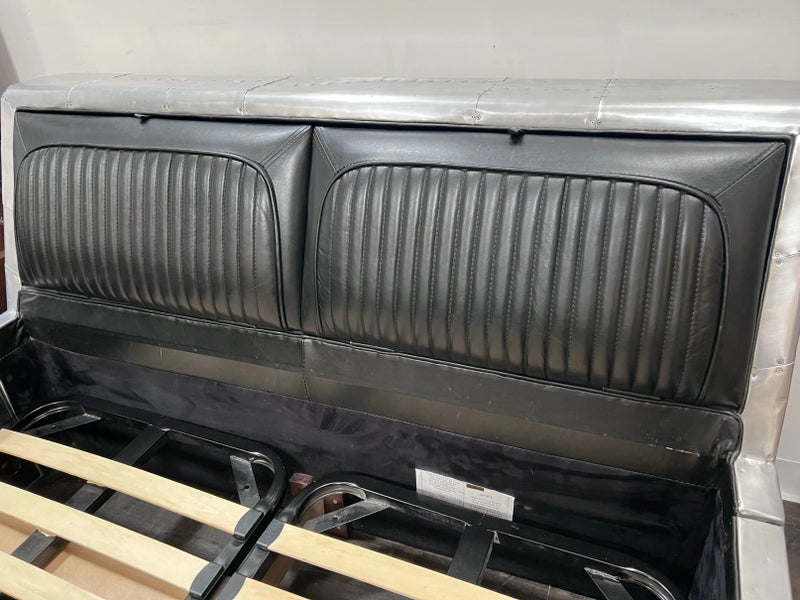 Design Plus Galley presents the Aviator Tomcat Full Size Bed Frame by Timothy Oulton. Reflecting the industrial aesthetic of the iconic military aircraft that inspired it, the Tomcat bed makes a commanding statement in the bedroom. Its sleek, aerodynamic lines are clad in multi-riveted Spitfire finish, while the headboard is covered in ribbed, softly worn leather. The headboard pulls forward to reveal a secret storage space behind. Totally cool, masculine and for the aviator in your life. Bed has been discontinued in the full size. Does not require a box spring.