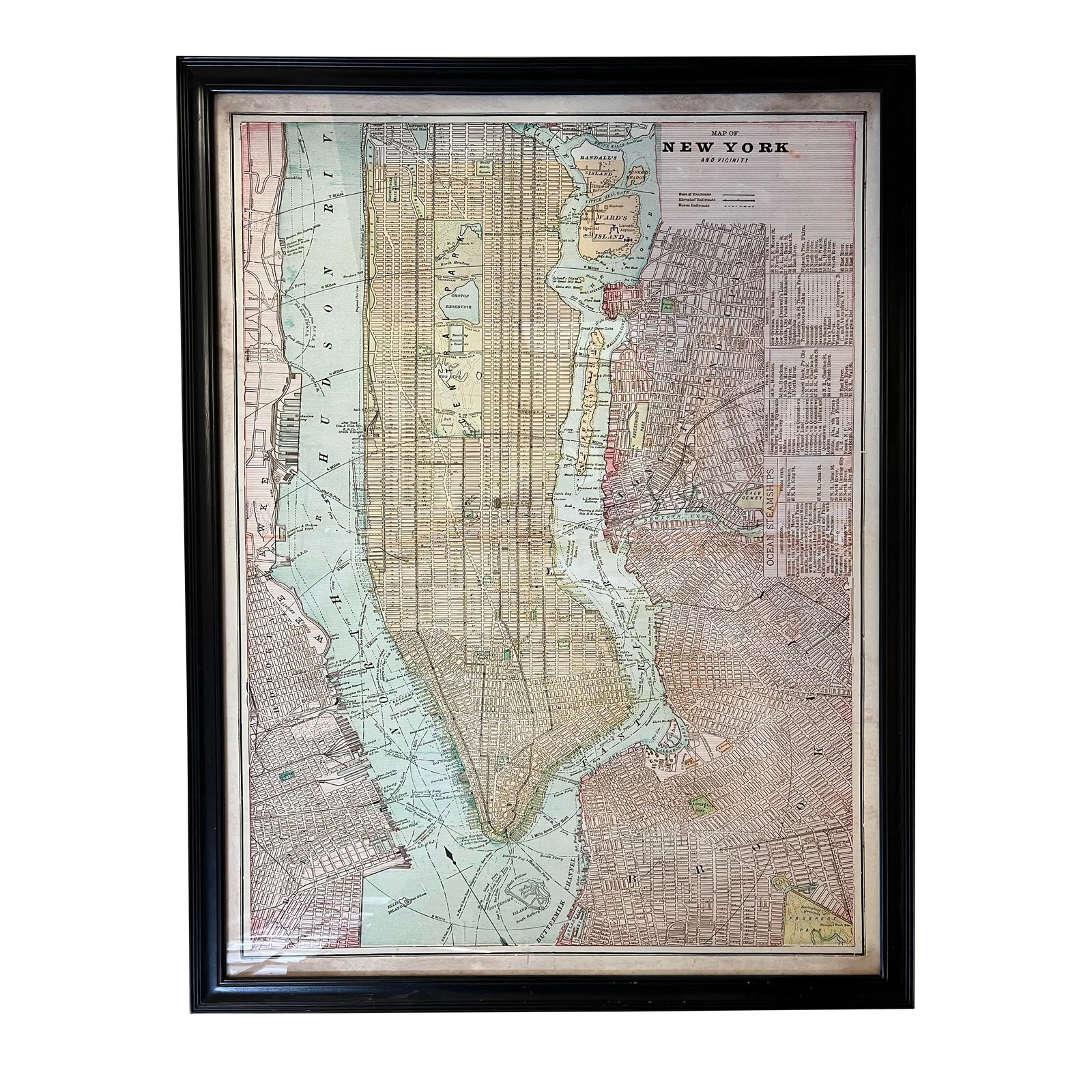 Design Plus Gallery presents a Monumental Artline Black Oak Framed New York City Map, by Timothy Oulton. Timothy Oulton historic city map print of New York and it’s surrounding boroughs in belvelled Solid Oak black wood frame. Timothy Oulton’s vintage map print reflects historic New York City and its surrounding boroughs. Quality black veneered frame with latches for hanging. Good condition, minor wear.