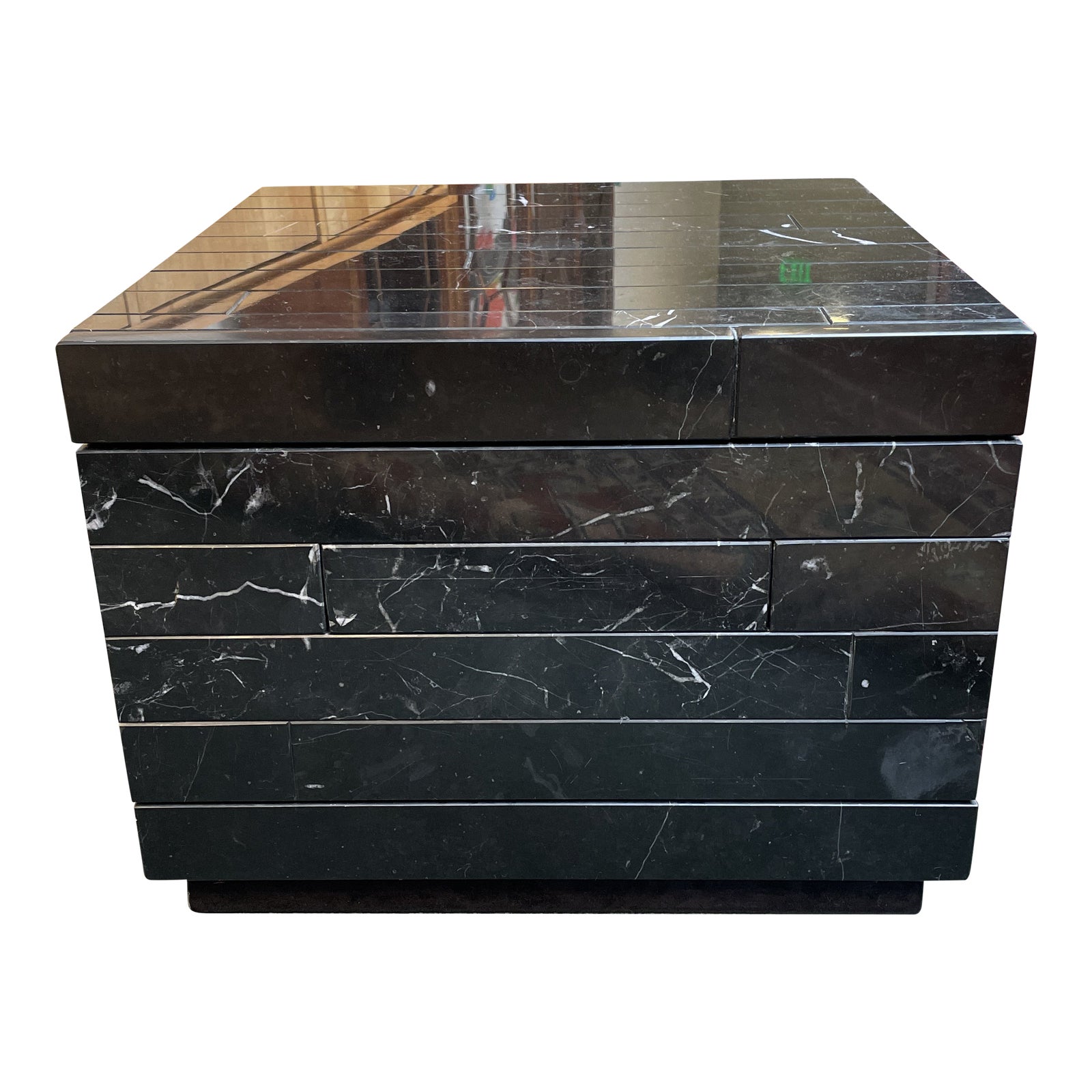 Design Plus Gallery presents a Timothy Oulton Style Side Table. Similar in clean silhouette and scale to “Marble Cube”, the nearly-square table uses marble for its crisp, clean cool effect. The white vein patterns contrast with the polished smooth surface. One deep drawer hides whatever.