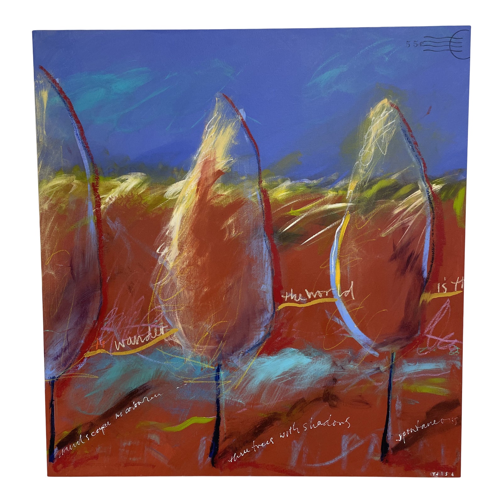 Design Plus Gallery presents a Tjaga Owen “Wander the World” Series II Painting. Painted on a canvas covered wood panel. A warm palette is rendered with trees in a horizon. Pastel and paint is layered on top with sayings. Artist signature is on the bottom right corner and art piece is titled and dated on the back. Little evidence of wear, good condition.