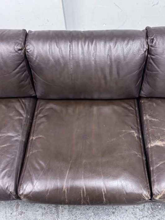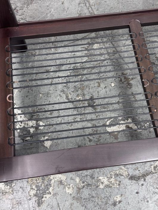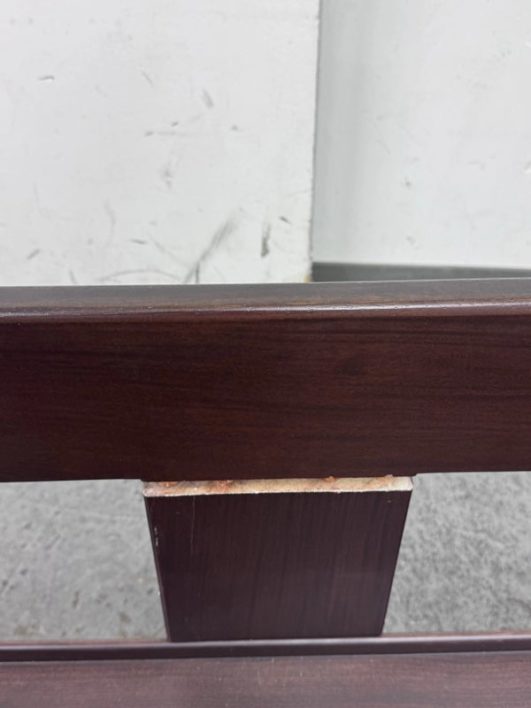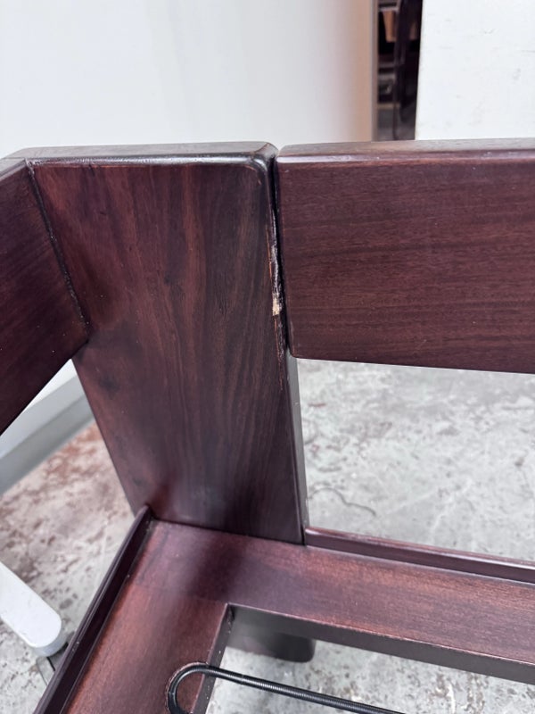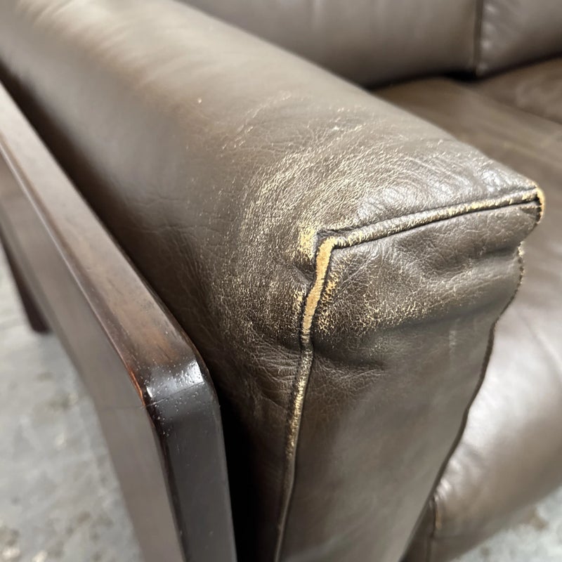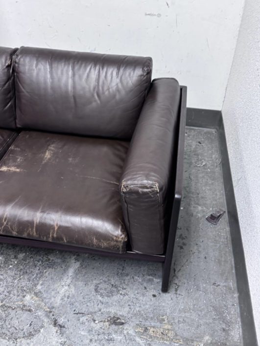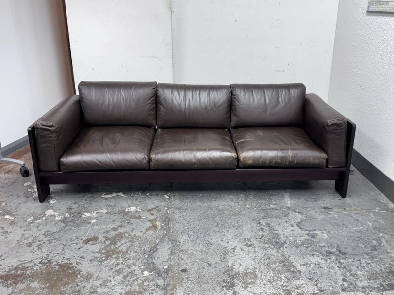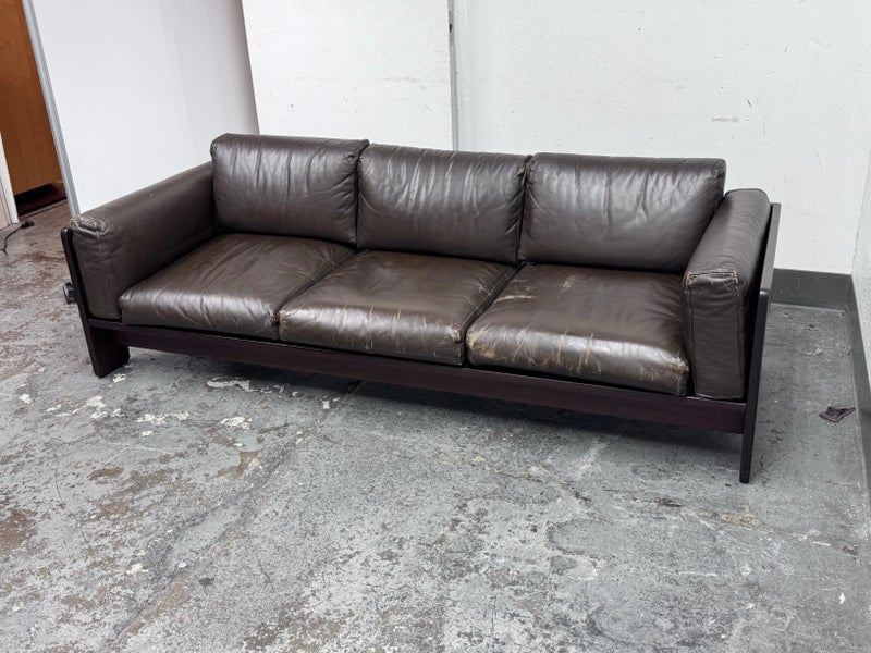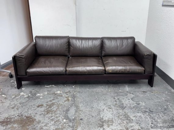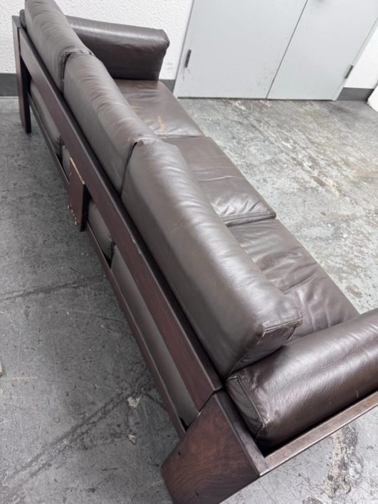 Design Plus Gallery presents the Bastiano Sofa from Knoll by Tobia Scarpa. The “Bastiano” sofa by Afra & Tobia Scarpa, designed for Knoll in 1962, epitomizes architectural design and luxury. The sofa’s arms are lower than the back, creating a distinctive square shape. Built from rosewood, the structure includes seat borders, arm sides, and under-seat and back sections in geometric flat shapes. The rosewood is varnished with clear enamel, enhancing its natural beauty and durability. All materials are original, thus showing signs of wear that are considered to be consistent with their vintage age + use. Breakage occurred to the back wood frame and has been repaired.