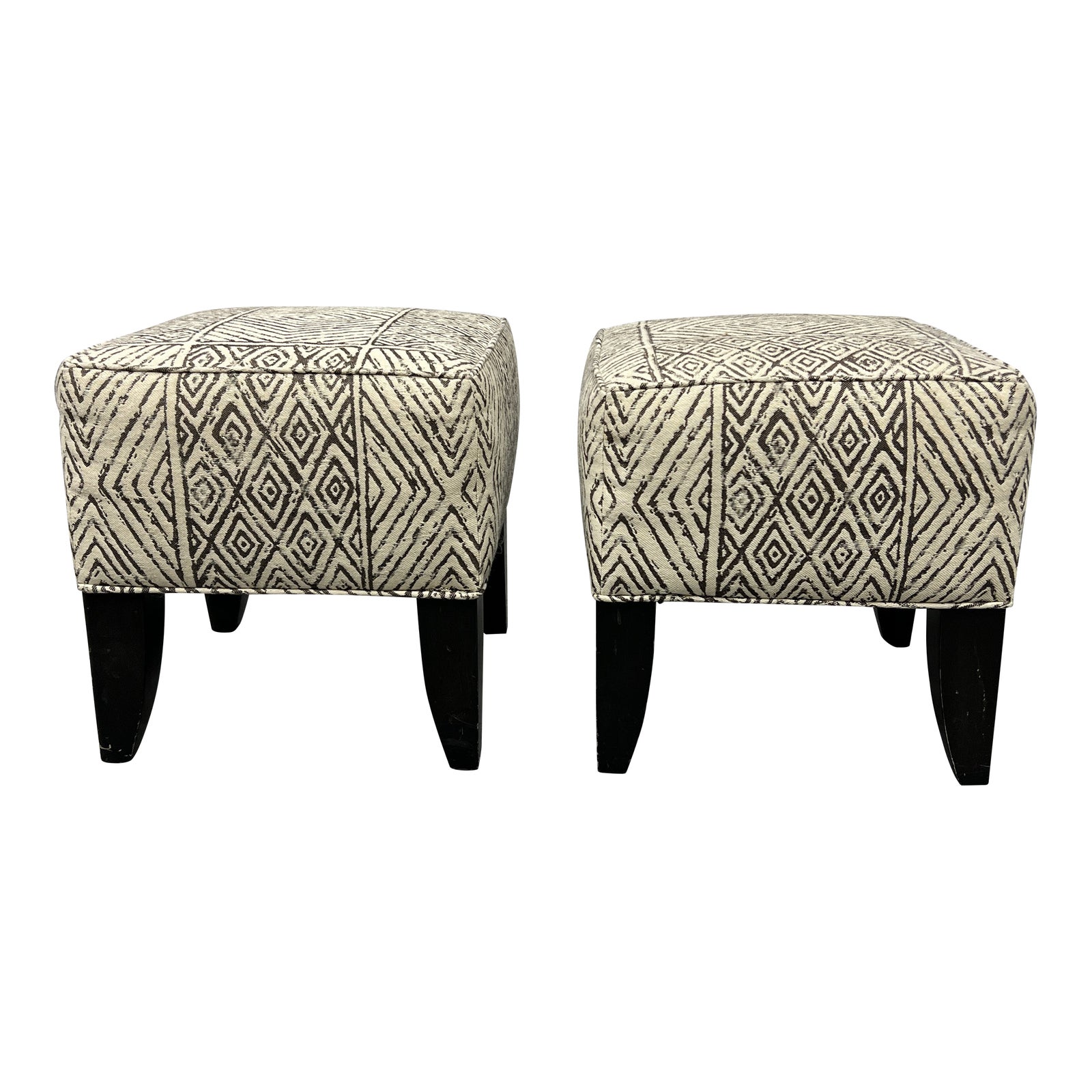 Design Plus Gallery presents the Todd Hase Pair of Jessie Ottomans. Features black-and-white upholstery with various diamond patterns. The legs are flat on outer surfaces, curved on inner surfaces, and made with wood given an espresso finish. Minor wear from age and use; ottomans are in good condition.