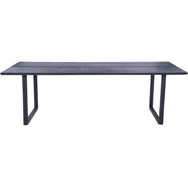Design Gallery Plus presents a Tokyo Black Table by HD buttercup. A double planked wood with a center space separation. The finish is black oak. Visible wear and minor cracking. The base as a pair of double U-Shape metal bases.