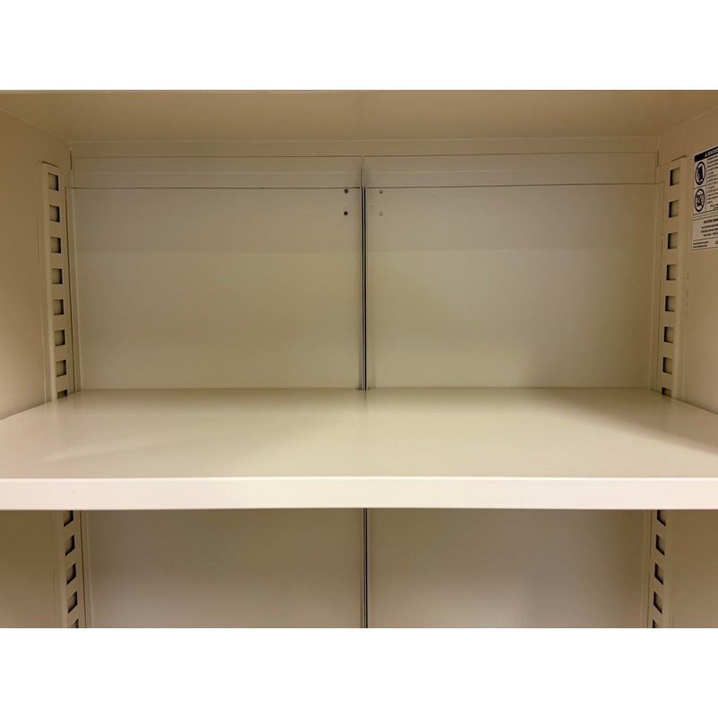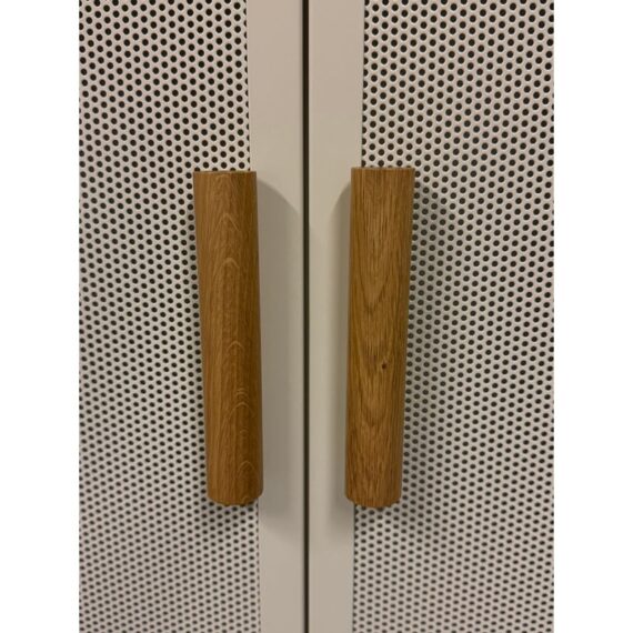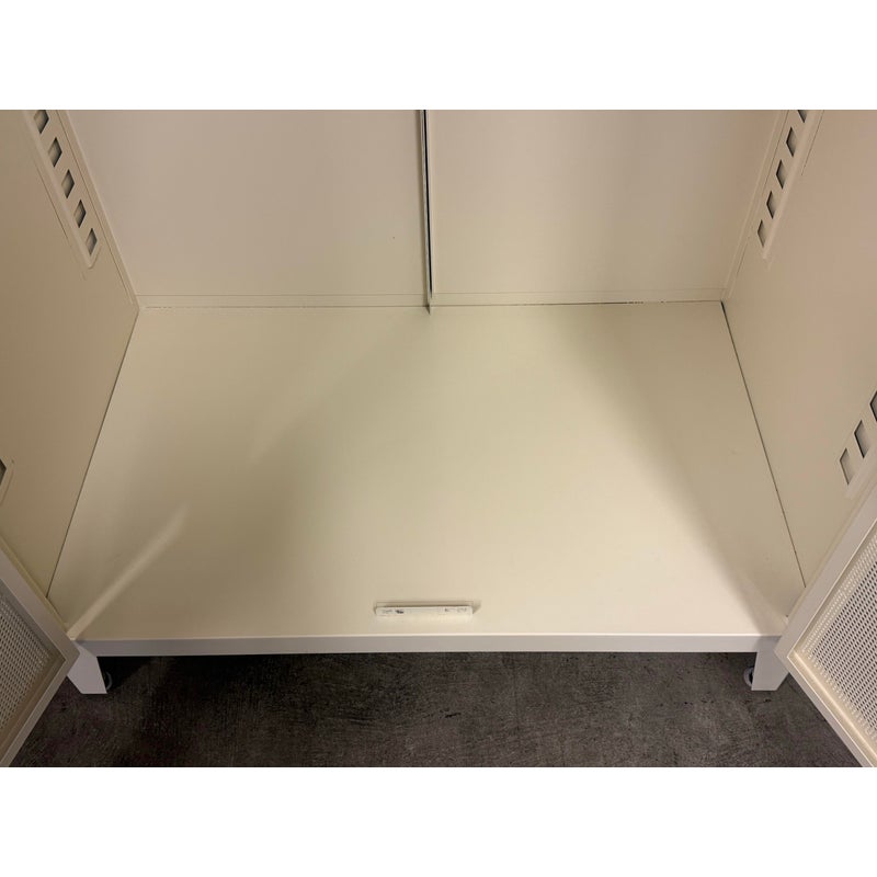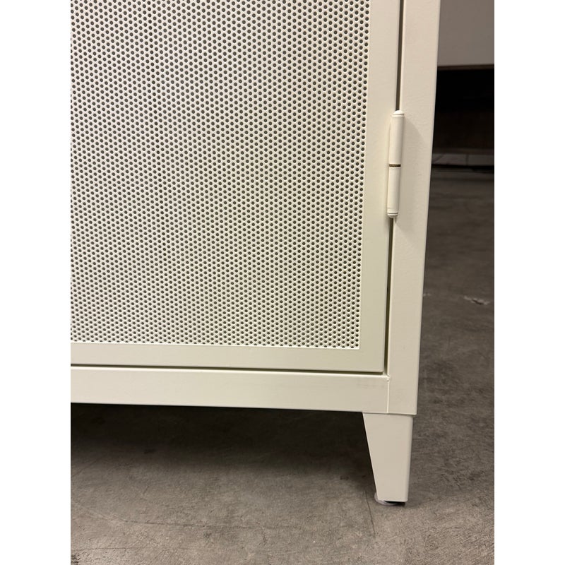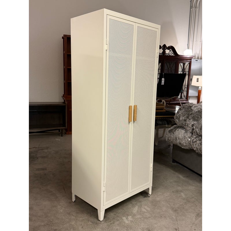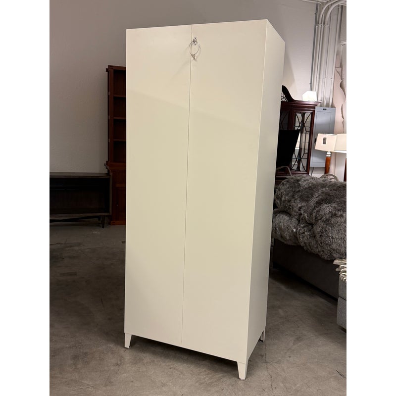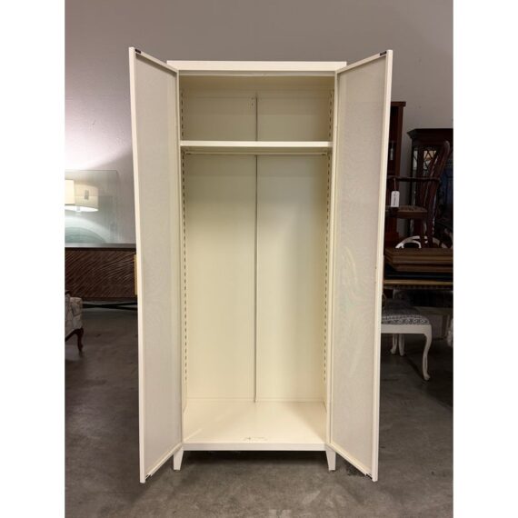 Design Plus Gallery presents the Perforated Haut Armoire by Tolix. In the 1920s, Tolix revolutionized the furniture industry with its use of structural sheet metal. This piece will withstand decades of use and its durable finish will remain beautiful the entire time. Tolix’s Perforated Collection breathes new life into their steel offerings. This sculptural armoire is thoughtfully appointed with a shelf and wardrobe for neatly storing clothing, linens, books and other personal belongings. We think it works as well in a bedroom or laundry room as it does in an office or garage. The color way of ivory is no longer in production for the B2 Armoire. The cabinet is in good overall condition with wear that is consistent with minimal usage.