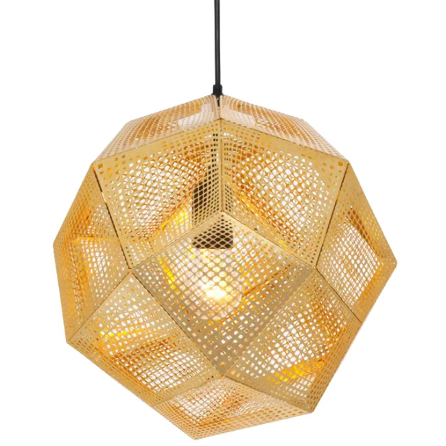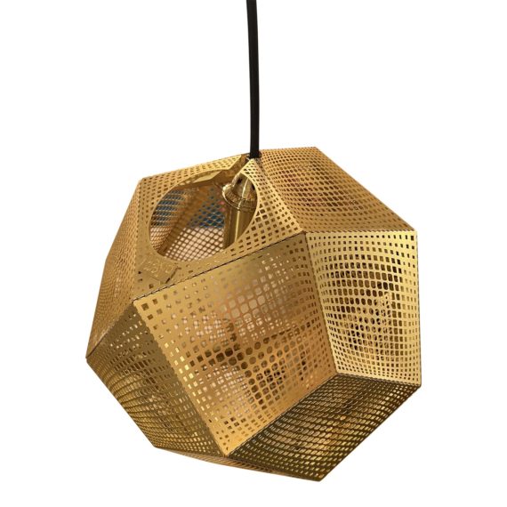 Design Plus Gallery presents an Etch Brass Pendant by Tom Dixon. This elegant geodesic pendant is made of digitally etched metal panels. The panels Casts an array of soft and vivid shadows on the wall and ceiling, making it an atmospheric luminaire for many applications. Tom Dixon started his eponymous brand in 2002. The company’s mission is to design, illuminate and furnish the future with innovative lighting, furniture and accessories. While Tom Dixon tabletop accessories are inspired by form and material, his extraordinary collection of lighting includes eye-catching pendant ceiling and wall lights that effortlessly illuminate a setting in luxury style. Minor wear, pendant is in good condition.