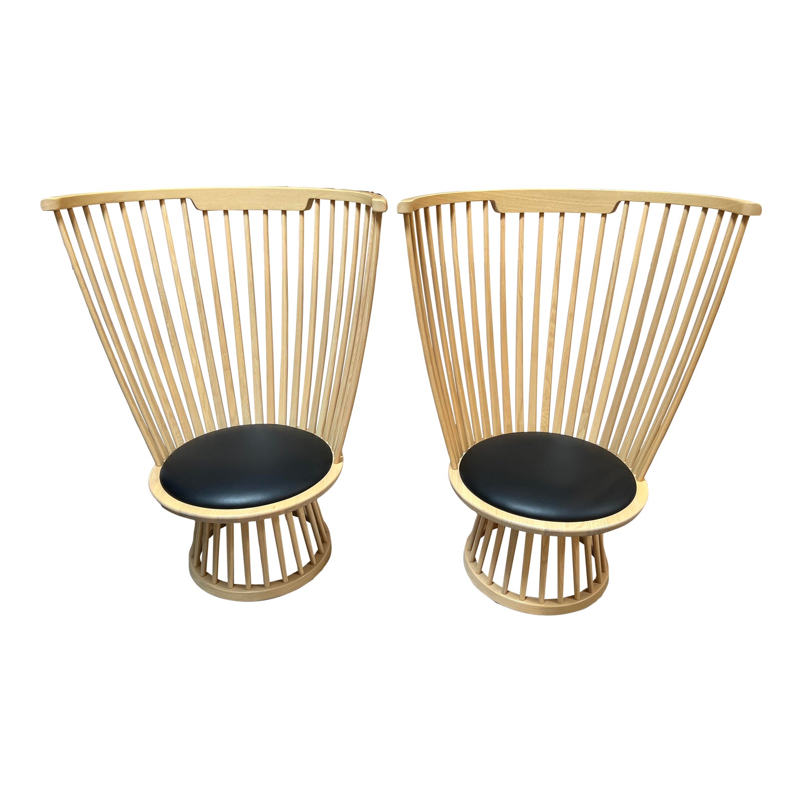 Design Plus Gallery presents a Pair of Fan Chairs by Tom Dixon. These airy chairs are a modern take on a British archetype. The classic Windsor chair is converted to a contemporary silhouette in birch, with a semi-transparent structure that takes up minimal visual space. Black leather fixed seat cushion. Light evidence of wear; condition is consistent with age and use.