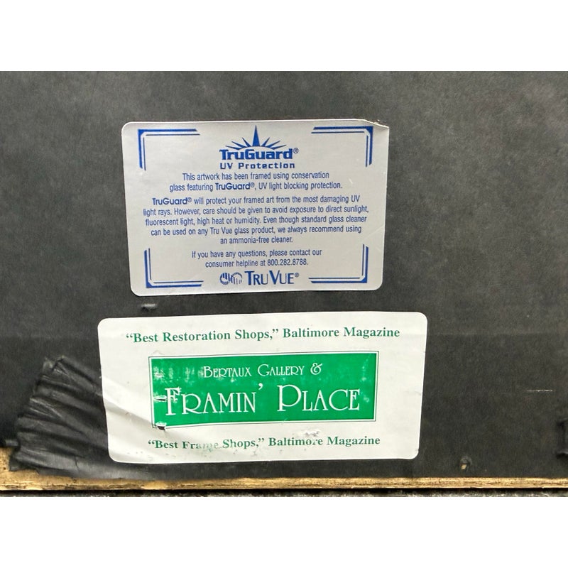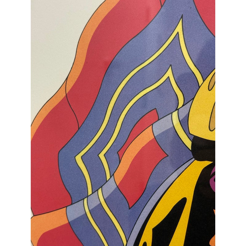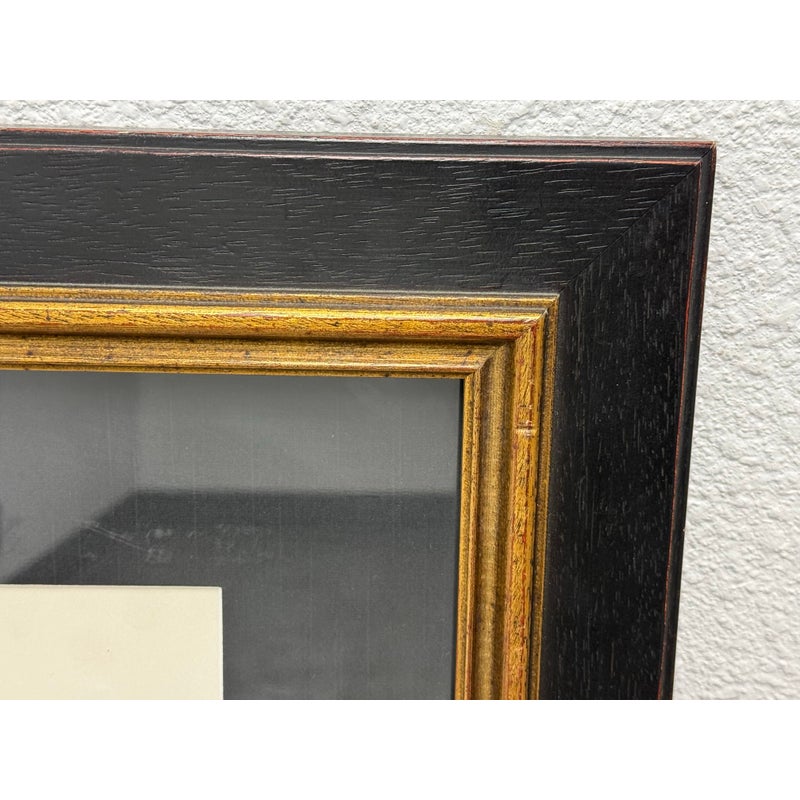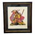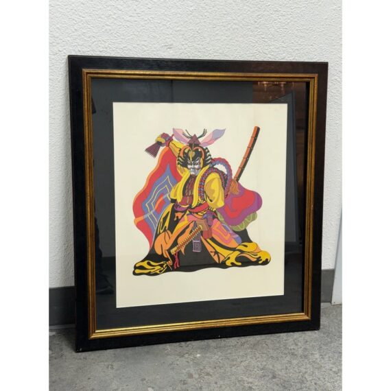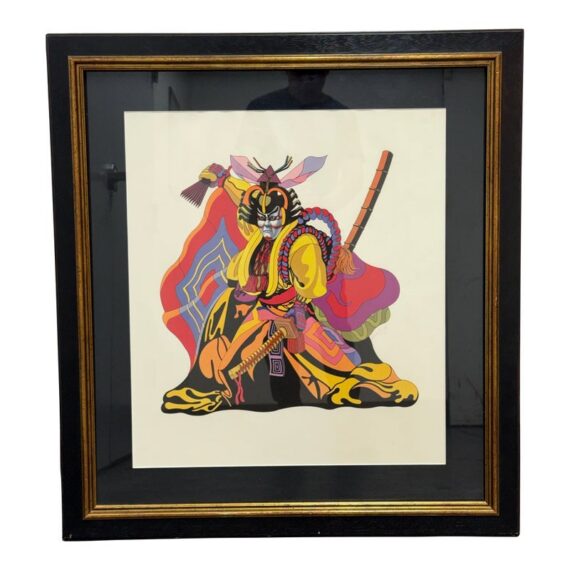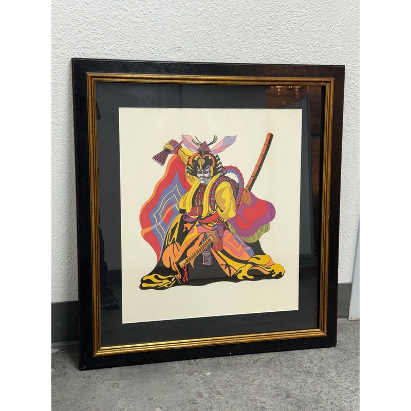 Design Plus Gallery presents the “Kubuki Actor” Print by Tom Kamifuji. This work presents a Kabuki warrior rendered in bold, graphic color with layered patterning and theatrical costume detail. The image is paired with a black mat and a black frame accented by a gold tone inner trim for a sharp, gallery ready presentation. Tom Kamifuji was a Palo Alto–based designer and artist recognized for graphic design and silkscreen work, and this composition became widely associated with mid-century advertising. The same design later appeared in a 1971 Suntory Royal Whisky campaign alongside the slogan “Dare to be different.” It is in good condition with visible and minimal wear from usage.