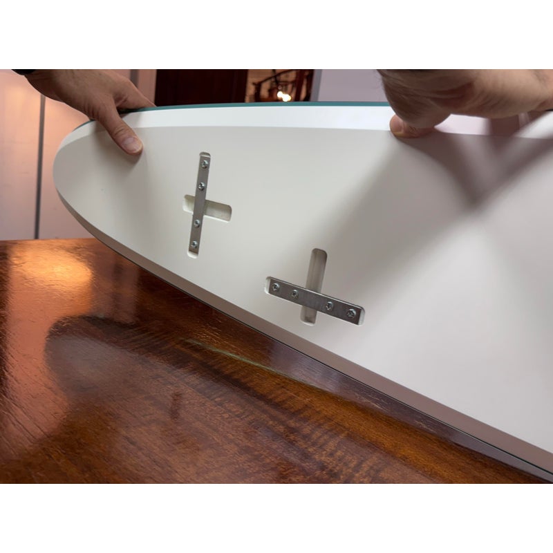 The mirror’s smooth surface and precise edging reflect Tonelli’s design-forward approach, allowing it to integrate seamlessly into a range of spaces without overpowering surrounding elements. Designed to be wall hung, it provides both functional reflection and sculptural impact.