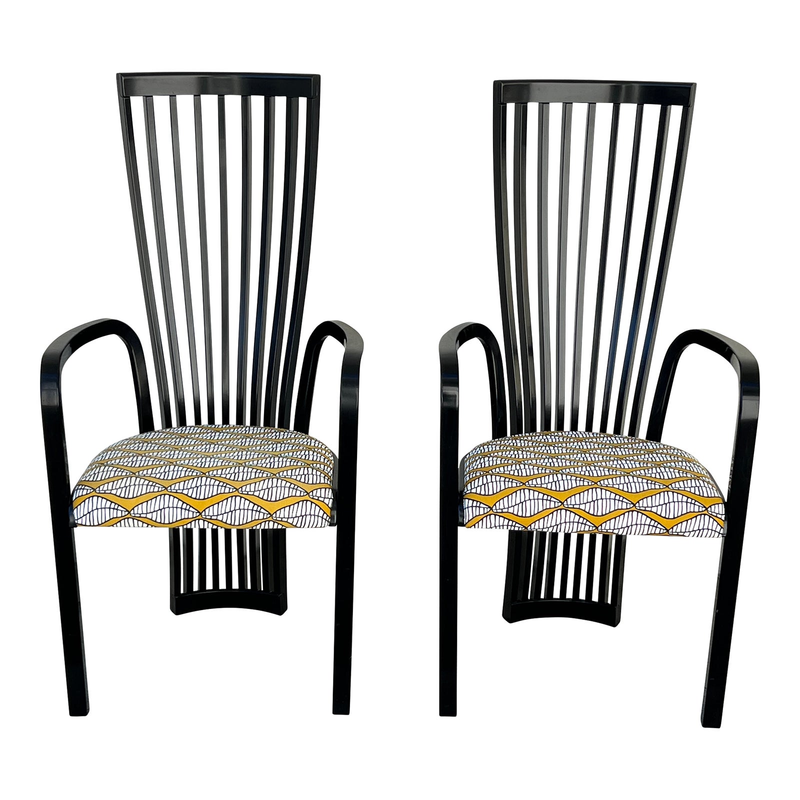 Design Plus Gallery presents a Pair of Postmodern Arm Chairs by Tonon, Italy. The handcrafted pair are finished in a gloss black lacquer and contrasted with modern upholstery. Rectangular spindles run the entire height of the chair, contoured for comfort, the arms race from the rear of the cushioned seat, out and down to the floor. A dramatic pair of chairs for dining, living or guest rooms. Light evidence of wear; condition is consistent with age and use.