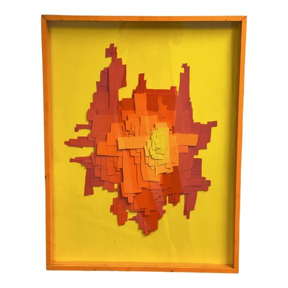Design Plus Gallery presents a Boldy Hued Topographical Piece of Wall Art. Built into an orange frame and matted on yellow, the colors of red to yellow, making a close resemblance to a city map showing the range of elevation. The grid like pattern of it will alway stand out even in its bold frame. In good condition with visible marking’s on frame and wear from usage + age.