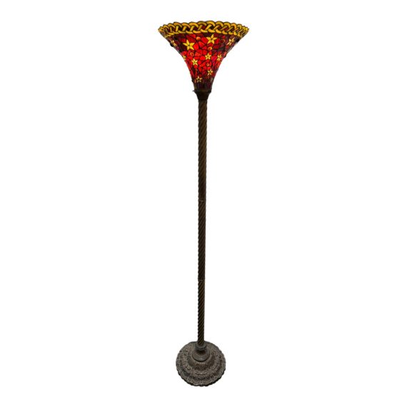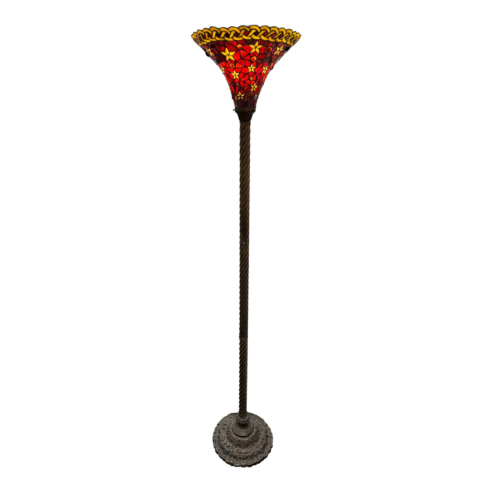 Design Plus Gallery presents a Stained Glass Torchiere Floor Lamp. Bold colors will brighten your living space with this red + yellow beauty. The metal has been cast to have decorative elements on the base and rod. The torchiere is in good condition with visible and minor wear that is consistent with age + use.