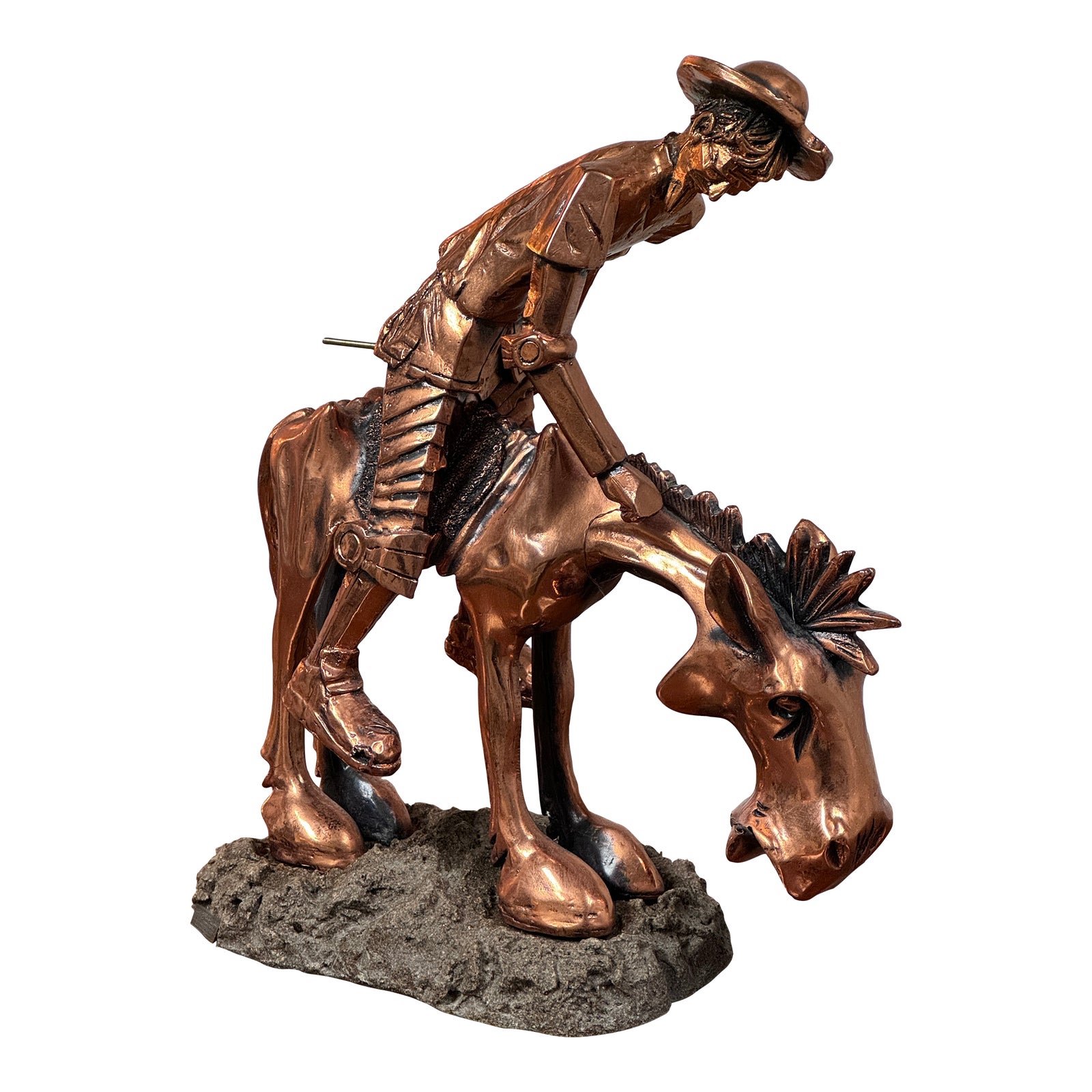 Design Plus Gallery presents a Don Quixote Copper Sculpture by Torogoz. This stunning Don Quixote sculpture features intricate details and a beautiful copper finish that adds a touch of elegance to any space. Don Quixote is depicted sitting on his horse, with a brass bent spear in hand. Crafted in El Salvador, this sculpture is a true work of art that captures the spirit of the classic literary character. The rich copper finish enhances the fine details of the sculpture, making it a captivating centerpiece for any room. Whether displayed on a shelf, mantel, or tabletop, this sculpture is sure to be a conversation starter and a cherished piece for any art enthusiast. In good condition, visible and minor wear. This is a discontinued model. Made in El Salvador.