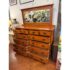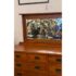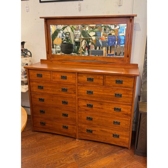 Design Plus Gallery presents a Mission Style Dresser with Mirror from Tradewins. The dresser has an overall cherry wood finish with dark bronze recessed drawer pulls, all original and in Mission/Arts & Crafts Style. The unit has a back splash mirror is affixed by screws and wood bars for security. The dresser has four top drawers that are all a quarter width in size and there are eight remaining drawers in two rows of four. Each of the twelve drawers are cedar line with metal hardware within for their smooth operation. The dresser is in good condition for its usage with minor visible wear for its usage. Made in the USA.